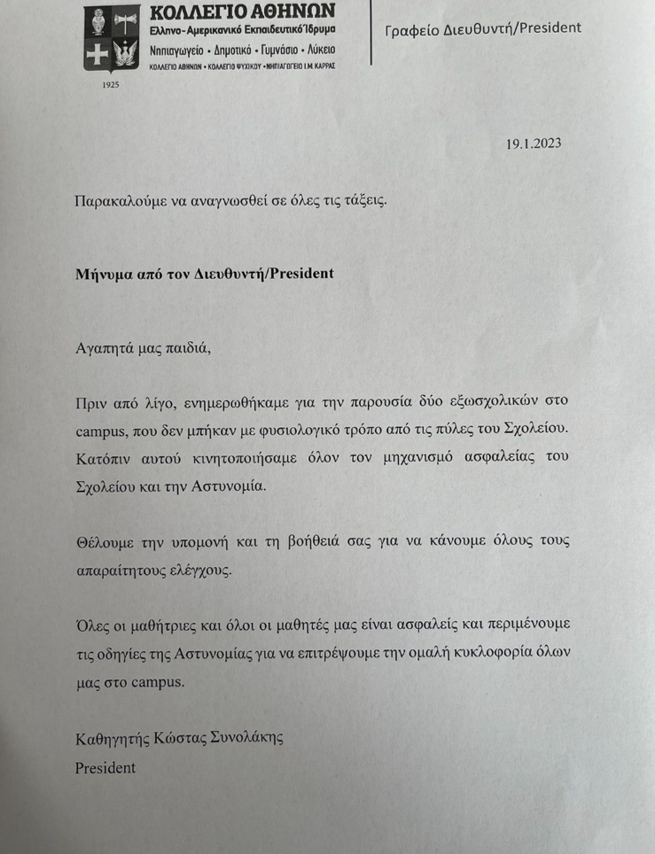 Το μήνυμα ανέφερε: «Πριν από λίγο ενημερωθήκαμε για την παρουσία δύο εξωσχολικών στο campus, που δεν μπήκαν με φυσιολογικό τρόπο από τις πύλες του Σχολείου.