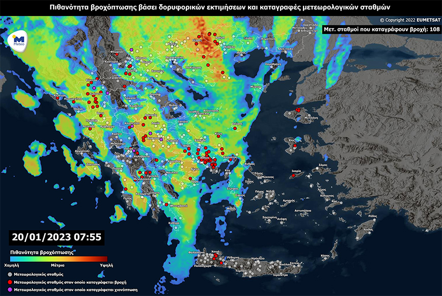 Στην Εικόνα 2 παρουσιάζονται οι περιοχές όπου υπήρξε πιθανότητα βροχόπτωσης ή χιονόπτωσης καθώς και οι σταθμοί όπου καταγράφηκε βροχόπτωση ή χιονόπτωση κατά το διάστημα λίγο πριν τις 08:00 της Παρασκευής 20/01.