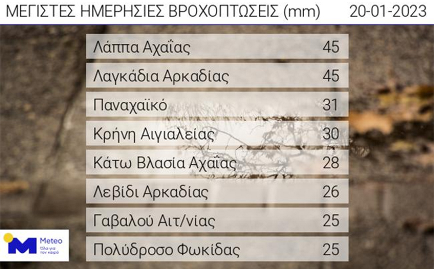 Ισχυρές βροχοπτώσεις αλλά και καταιγίδες εκδηλώθηκαν κατά τη διάρκεια της νύχτας της Πέμπτης 19/01 προς Παρασκευή 20/01 με το μεγαλύτερο ύψος βροχής έως τις 08:30 περίπου της Παρασκευής 20/01 να καταγράφεται από τους σταθμούς του Λάππα Αχαΐας και των Λαγκαδίων Αρκαδίας και ήταν ίσο με 45 χιλιοστά. Στον πίνακα της Εικόνας 1 παρουσιάζονται οι 8 σταθμοί του δικτύου αυτόματων μετεωρολογικών σταθμών του Εθνικού Αστεροσκοπείου Αθηνών / meteo.gr που κατέγραψαν τα μεγαλύτερα ύψη βροχής έως τις 08:30 της Παρασκευής 20/01.