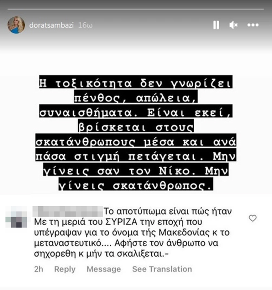 Με μία ανάρτηση στο Instagram αναφέρθηκε στο μήνυμα που προκάλεσε την αντίδρασή της, αναφερόμενη σε «τοξικότητα που δεν γνωρίζει πένθος, απώλεια, συναισθήματα».