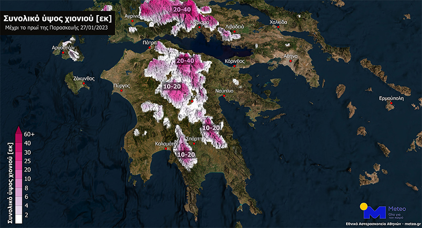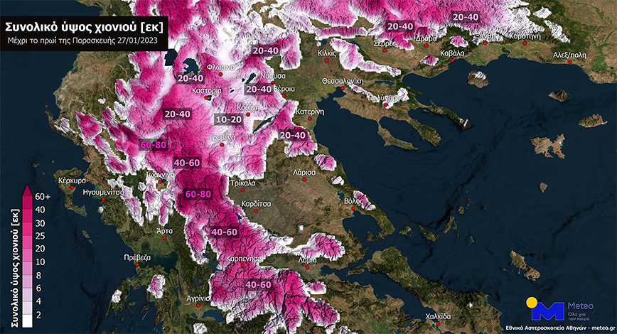 Πυκνές χιονοπτώσεις θα εκδηλωθούν στα ηπειρωτικά ορεινά καθώς και σε ημιορεινές περιοχές της Βορειοδυτικής, Κεντρικής και Βόρειας Ελλάδας (ενδεικτικά υψόμετρα πάνω από τα 600 μέτρα και πάνω από τα 300-400 μέτρα στη Δυτική Μακεδονία). Χιονοπτώσεις αναμένονται σε αρκετές πόλεις της Δυτικής Μακεδονίας. Οι χιονοπτώσεις κατά τόπους θα συνεχιστούν και μετά την αλλαγή της ημέρας. Στους προγνωστικούς χάρτες που ακολουθούν αποτυπώνονται τα εκτιμώμενα αθροιστικά ύψη χιονιού μέχρι το πρωί της Παρασκευής 27/01.