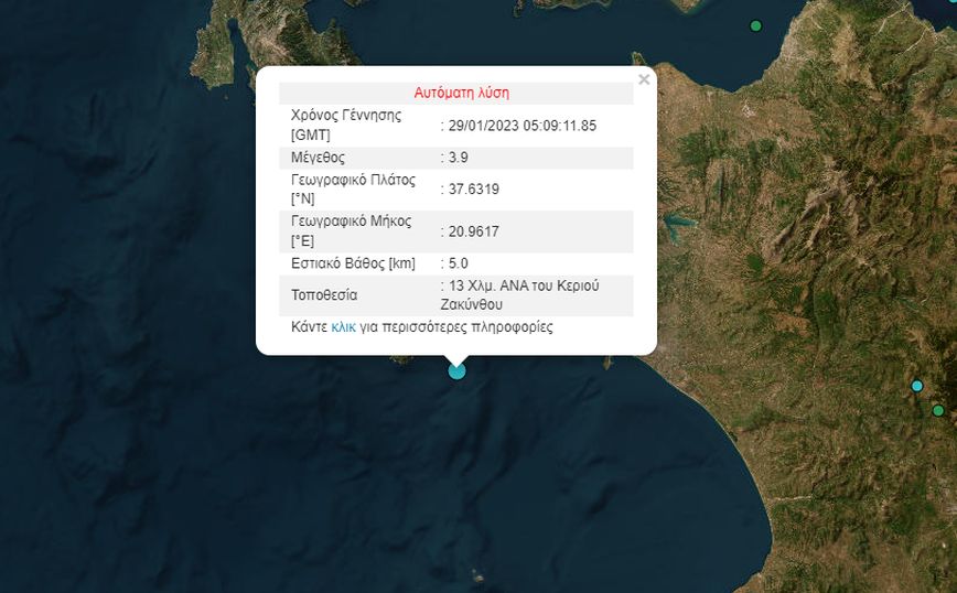 Σεισμική δόνηση μεγέθους 3,9 βαθμών της κλίμακας Ρίχτερ σημειώθηκε λίγο μετά τις 07:00 στη Ζάκυνθο, σύμφωνα με το Γεωδυναμικό Ινστιτούτο του Εθνικού Αστεροσκοπείου Αθηνών.