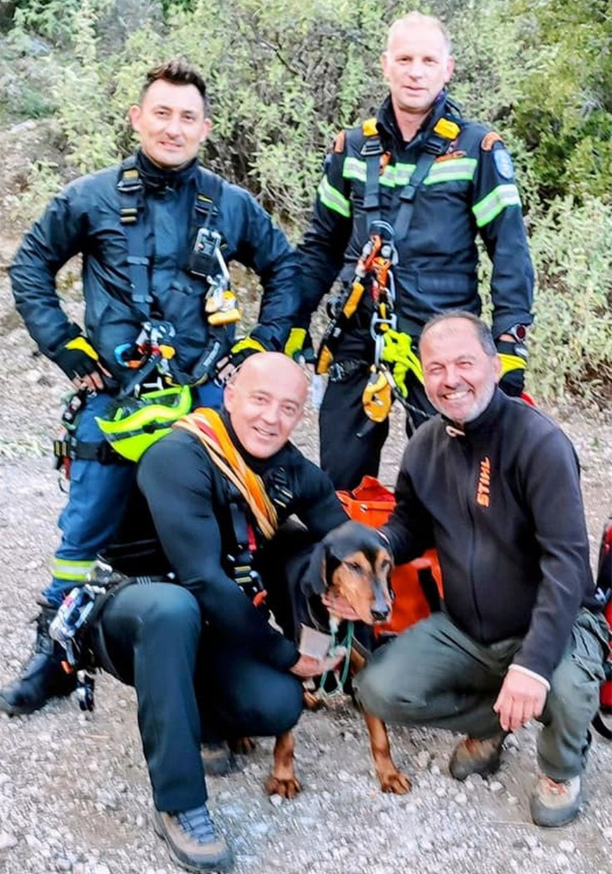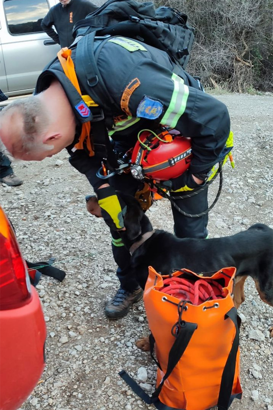 Τελικά, με σχοινιά κατέβηκαν σε βάθος 50 μέτρων στο φαράγγι και κατάφεραν να απεγκλωβίσουν σώο το εξαντλημένο σκυλάκι, το οποίο είναι και πάλι στην αγκαλιά του ιδιοκτήτη του.