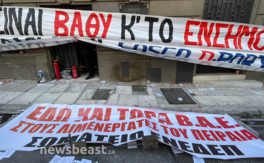 Λιμενεργάτες στις προβλήτες του Πειραιά πραγματοποιούν από το πρωί κατάληψη στο κτίριο του Συνδέσμου Ελλήνων Βιομηχάνων (ΣΕΒ) στην οδό Ξενοφώντος στο Σύνταγμα. Η κινητοποίηση διοργανώθηκε από το σωματείο των λιμενεργατών, την ΕΝΕΔΕΠ με βασικό αίτημα την εφαρμογή των βαρέων και ανθυγιεινών ενσήμων, για τον κλάδο όπως ορίζει η νομοθεσία. «Εδώ και τώρα ένσημα Βαρέα για τους λιμενεργάτες του Πειραιά», γράφει το πανό στην είσοδο του κτιρίου. Στο πλευρό τους βρίσκεται και ο Χρήστος Κατσώτης, μέλος της ΚΕ και βουλευτής του ΚΚΕ.