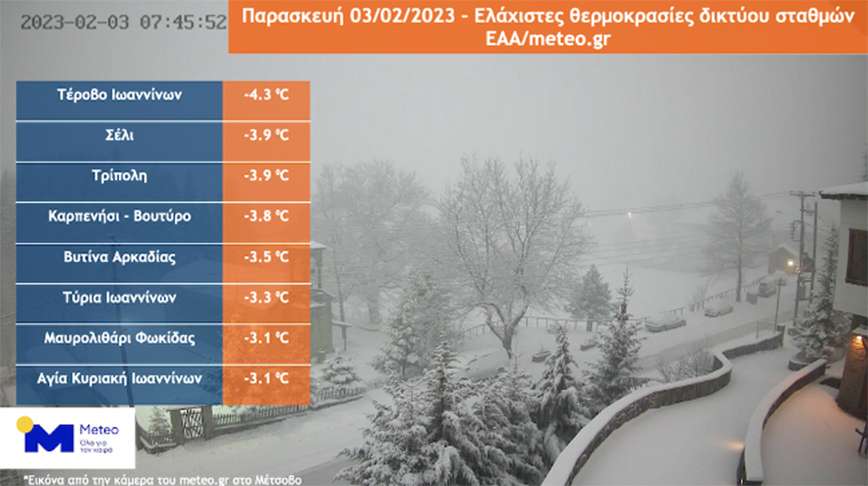 Οι επόμενες χαμηλότερες ελάχιστες θερμοκρασίες, σύμφωνα με το δίκτυο των αυτόματων μετεωρολογικών σταθμών του Εθνικού Αστεροσκοπείου Αθηνών/meteo.gr, καταγράφηκαν σε Σέλι (-3,9), Τρίπολη (-3,9), Βουτύρο Καπρενησίου (-3,8) και Βυτίνα Αρκαδίας (-3,5 βαθμοί).
