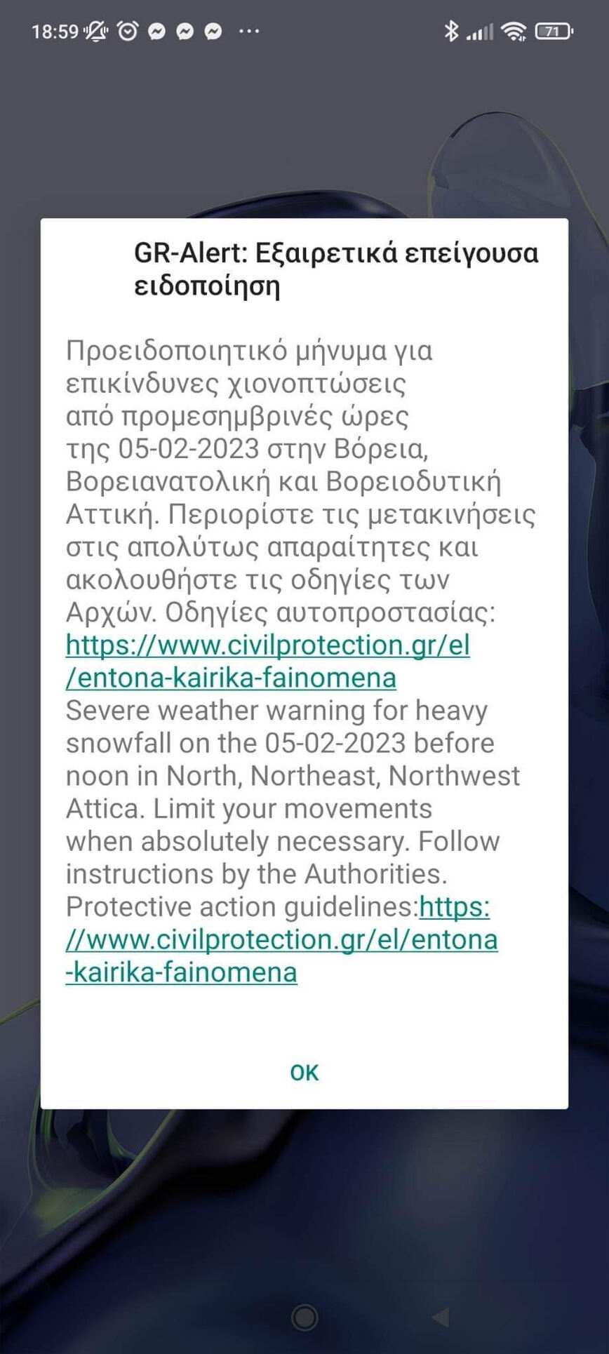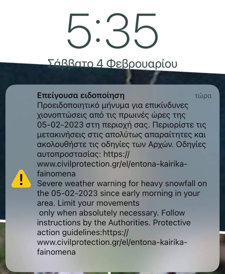 Συγκεκριμένα το μήνυμα αναφέρει: «Προειδοποιητικό μήνυμα για επικίνδυνες χιονοπτώσεις από τις πρωινές ώρες της 5/2/2023 στην περιοχή σας. Περιορίστε τις μετακινήσεις στις απολύτως απαραίτητες και ακολουθήστε τις οδηγίες των Αρχών».