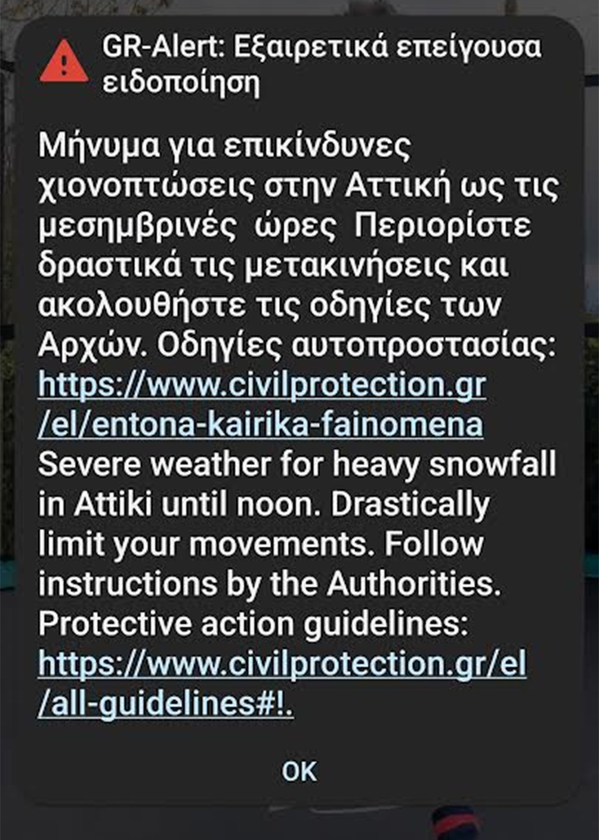 Νέο μήνυμα από το 112 εστάλη πριν λίγα λεπτά στους κατοίκους της Αττικής για την κακοκαιρία Μπάρμπαρα. Το μήνυμα αναφέρεται σε επικίνδυνες χιονοπτώσεις στην Αττική ως το μεσημέρι και καλεί τους κατοίκους να περιορίσουν τις μετακινήσεις τους και να ακολουθήσουν τις οδηγίες των Αρχών.