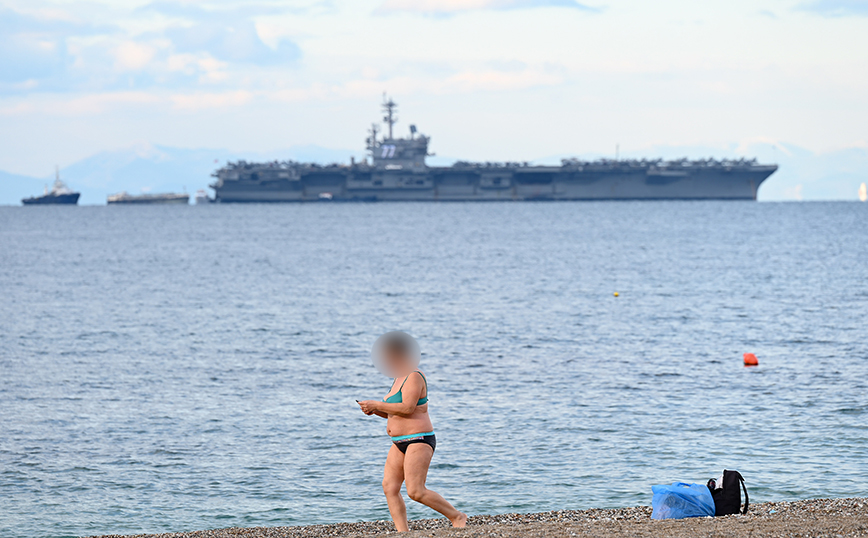 Φωτογραφίες δείχνουν τους λίγους ατρόμητους κολυμβητές να απολαμβάνουν τις βουτιές τους στον Άλιμο, με φόντο το αμερικανικό αεροπλανοφόρο «George H.W.Bush», το οποίο βρίσκεται στην περιοχή.