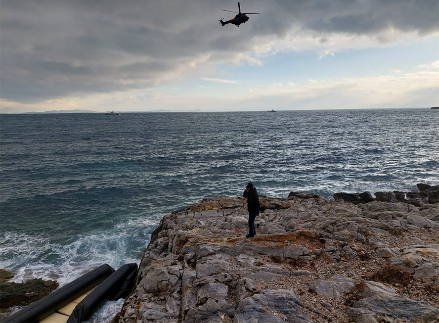 Ειδικότερα, μετά από εντοπισμό λέμβου σε βραχώδες σημείο στην ως άνω περιοχή, ξεκίνησαν άμεσα έρευνες από Πλοίο Ανοικτής Θαλάσσης (Π.Α.Θ.) Λ.Σ.-ΕΛ.ΑΚΤ., δύο περιπολικά σκάφη Λ.Σ.-ΕΛ.ΑΚΤ., ένα ελικόπτερο SUPER PUMA της Π.Α. από αέρος, ενώ από ξηράς επιχειρούν στελέχη Λ.Σ.-ΕΛ.ΑΚΤ. και κλιμάκια ΕΛ.ΑΣ και Π.Υ.