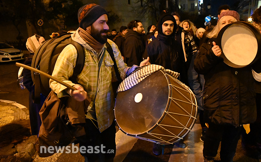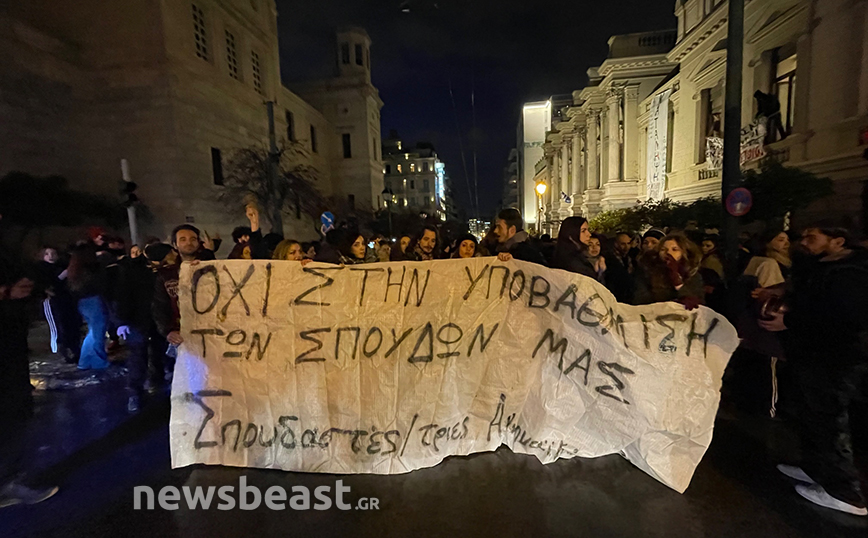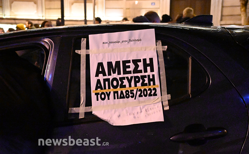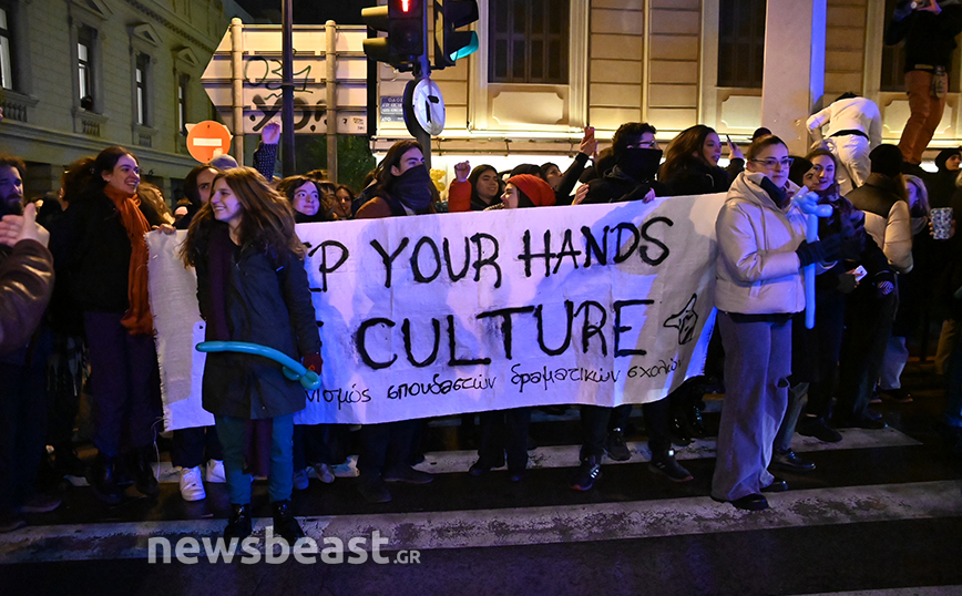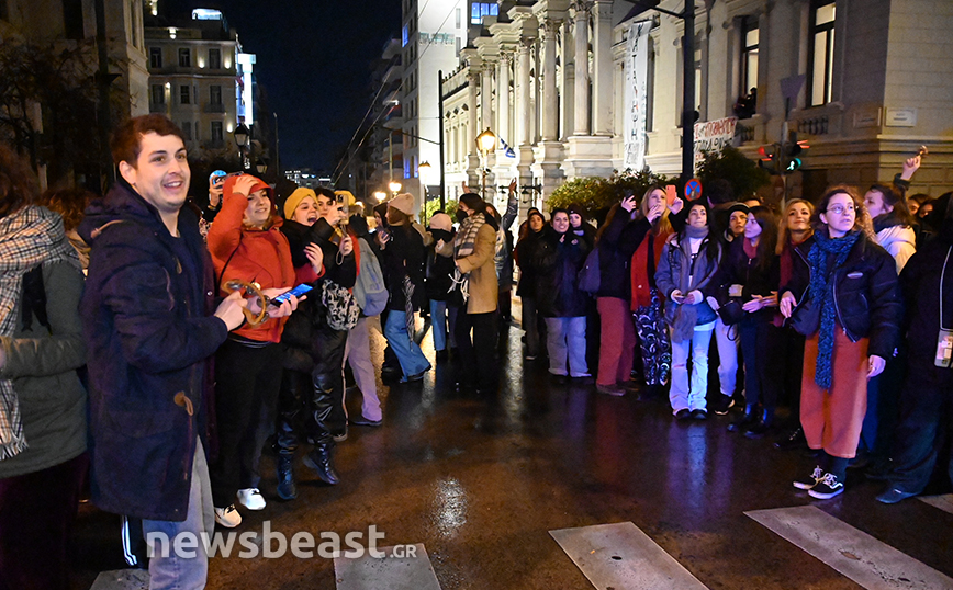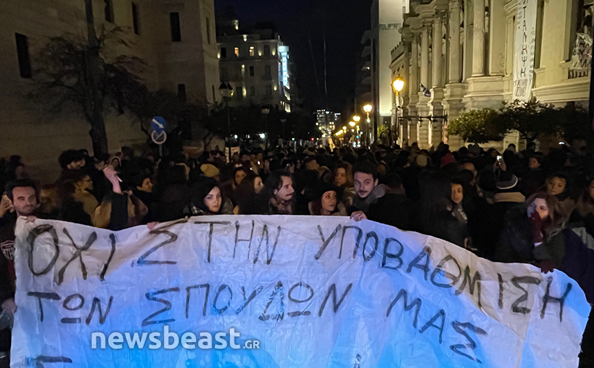 Οι καλλιτέχνες βρίσκονται έξω από το Εθνικό Θέατρο και πραγματοποιούν συγκέντρωση διαμαρτυρίας διαμαρτυρόμενοι για το νέο νομοσχέδιο, το οποίο υποβαθμίζει τα πτυχία τους, σύμφωνα με τους ίδιους.
