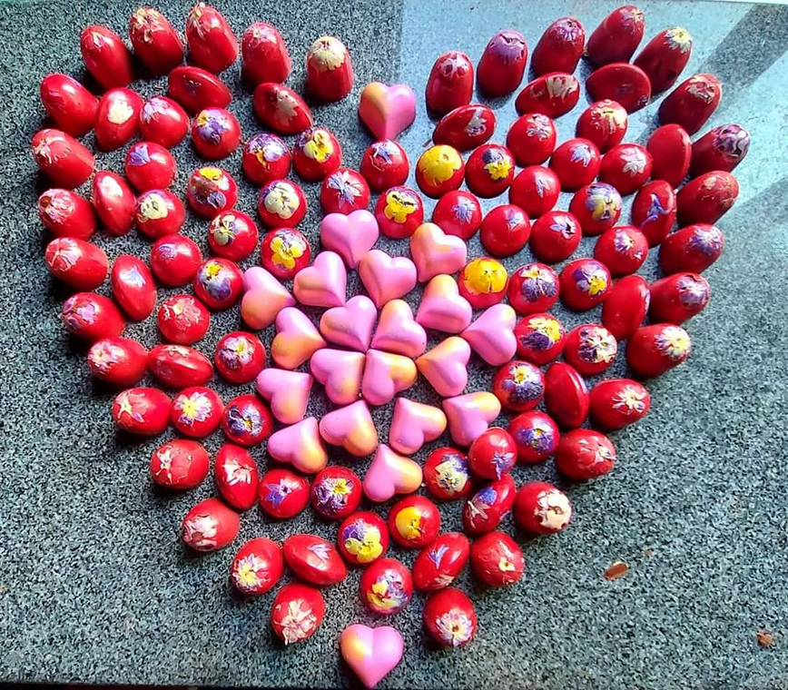 «Κάθε μπουκιά από τα σοκολατάκια, θα αποκαλύπτει κι ένα λουλούδι που τρώγεται», λέει η κ. Κουίδου και σημειώνει ότι θα είναι με γέμιση σως φράουλας και «εννοείται ότι όλα είναι παρασκευασμένα με βιολογικές πρώτες ύλες». Μεταξύ των βρώσιμων λουλουδιών που έχουν «κρυφτεί» μέσα στις σοκολατένιες δημιουργίες, συμπεριλαμβάνονται -σύμφωνα με την ίδια- βιόλες, φλόγες, γκάβρια, γαρύφαλλο, το «λουλούδι της ωραίας Ελένης», το βοράγκιο και το κενταύριο, το βότανο που σύμφωνα με τη μυθολογία που θεράπευσε το κένταυρο Χείρωνα στη μάχη των Τιτάνων, όταν τον χτύπησε ο Ηρακλής.