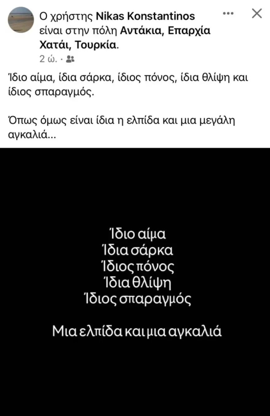 «Ίδιο αίμα, ίδια σάρκα, ίδιος πόνος, ίδια θλίψη και ίδιος σπαραγμός. Όπως όμως είναι ίδια η ελπίδα και μια μεγάλη αγκαλιά...». Αυτό ήταν το συγκλονιστικό μήνυμα ενός από τα πρώτα μέλη της πρώτης αποστολής της ΕΜΑΚ για τον σεισμό στην Τουρκία, Κώστας Νίκας.