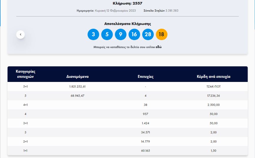 Απόψε, Κυριακή 12 Φεβρουαρίου 2023, στην κλήρωση 2557 του Τζόκερ του ΟΠΑΠ, θα μοιραστούν στους τυχερούς της πρώτης κατηγορίας τουλάχιστον 1.700.000 ευρώ.