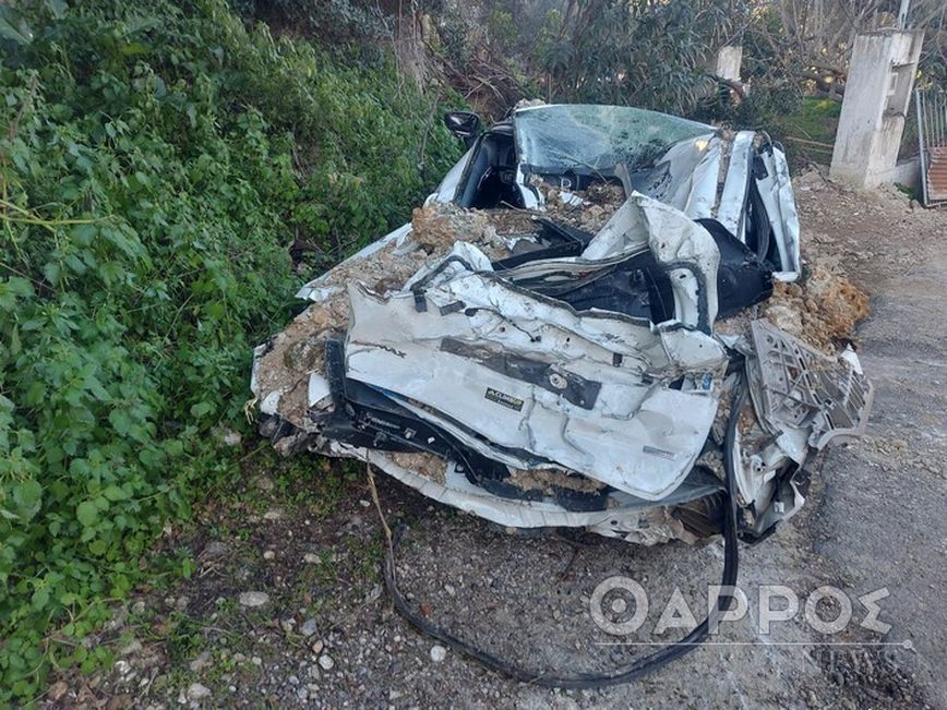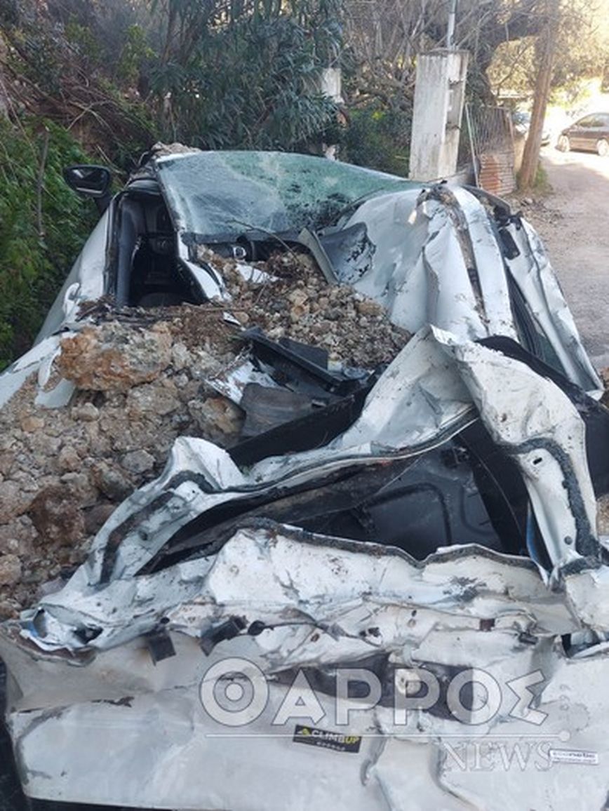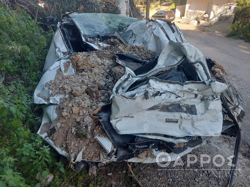 Σοκαρισμένη παραμένει ακόμα μια οικογένεια στα Λέικα της Καλαμάτας, από όταν αντίκρισε το αυτοκίνητό της να έχει γίνει ένα με το έδαφος, καθώς καταπλακώθηκε από βράχο.