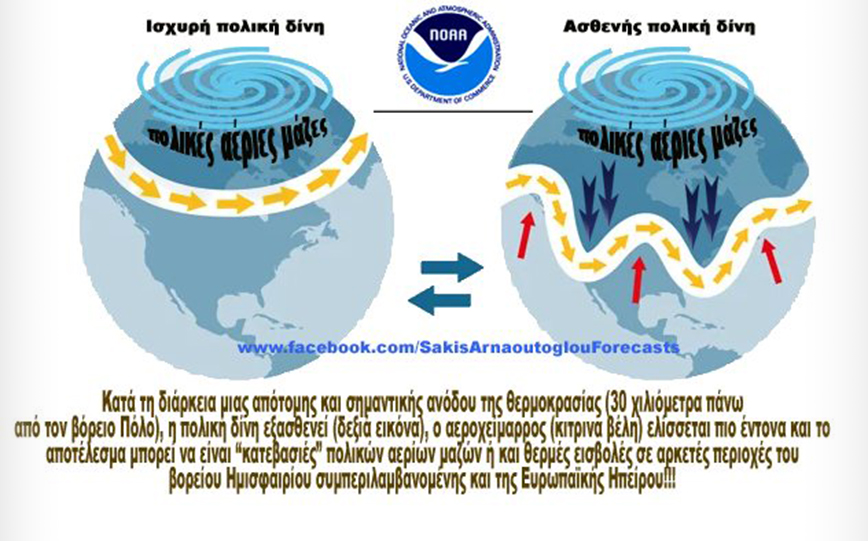 Με ανάρτησή του στο Facebook ο παρουσιαστής του καιρού της ΕΡΤ σημείωσε πως: «»Και τα τελευταία προγνωστικά στοιχεία επιμένουν ότι στο τέλος της εβδομάδας που διανύουμε η πολική δίνη θα καταρρεύσει και αυτό μπορεί να έχει εκτεταμένες συνέπειες στον καιρό στο βόρειο Ημισφαίριο συμπεριλαμβανομένης φυσικά και της Ευρώπης προς τα τέλη Φλεβάρη – αρχές Μάρτη».