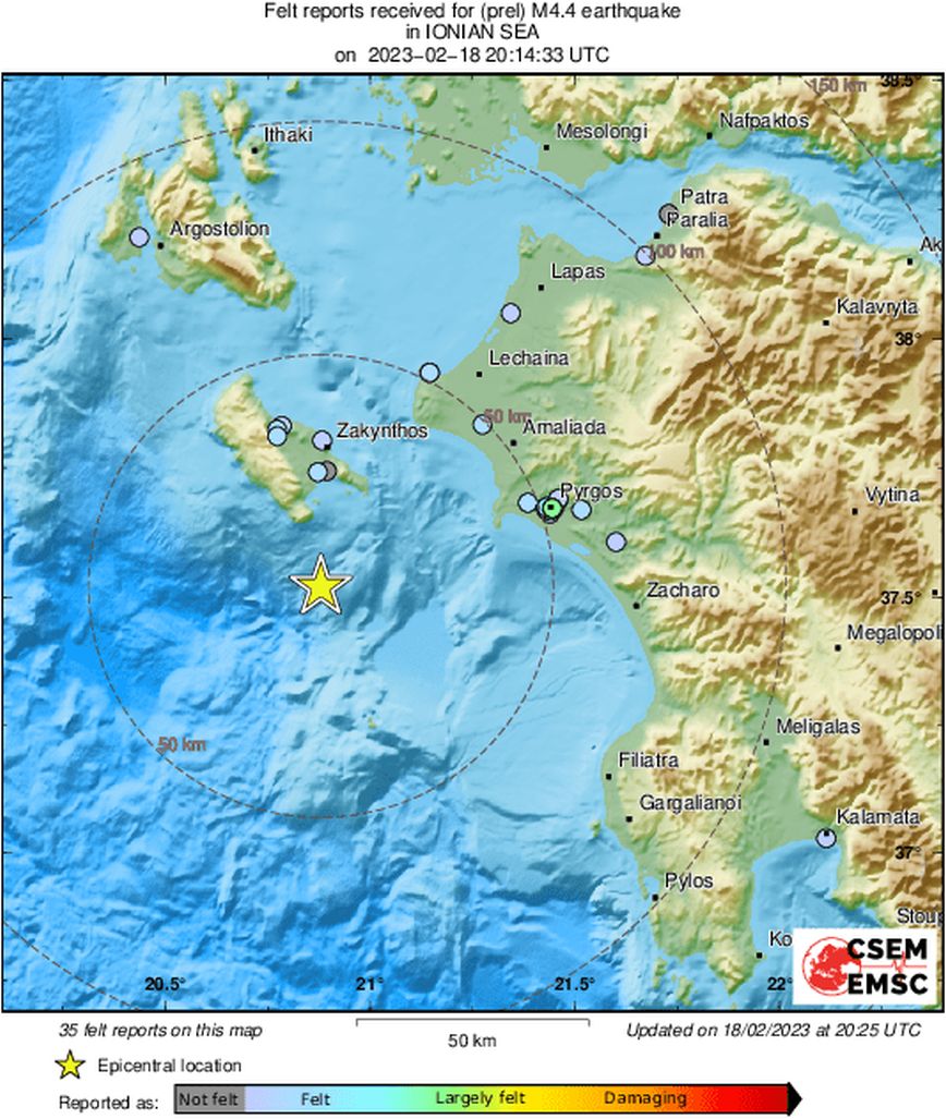 Το Ευρωμεσογειακό Ινστιτούτο υπολογίζει το μέγεθος του σεισμού στα 4,4 Ρίχτερ και το επίκεντρο στα 29 χιλιόμετρα νότια της Ζακύνθου.