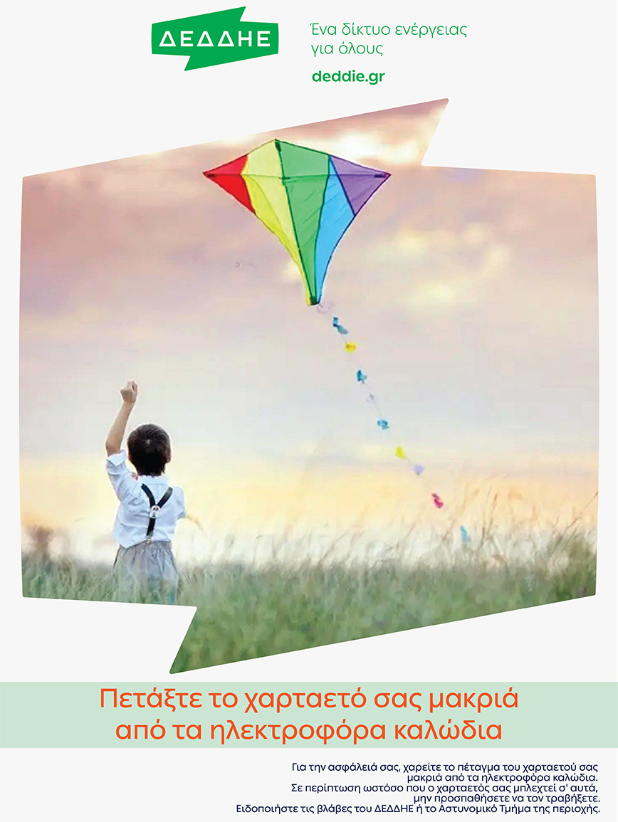 Ο ΔΕΔΔΗΕ δίνει οδηγίες για το πέταγμα του χαρταετού ενόψει της Καθαράς Δευτέρας και συμβουλεύει να μην πετάτε το χαρταετό σας κοντά σε ηλεκτροφόρα καλώδια, καθώς υπάρχει σοβαρός κίνδυνος ηλεκτροπληξίας για εσάς και διακοπής της παροχής ρεύματος στη γύρω περιοχή.