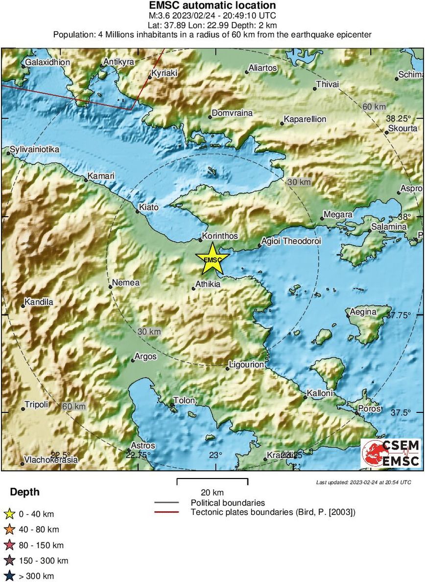 Σεισμός σημειώθηκε στην περιοχή της Κορίνθου. Η σεισμική δόνηση ήταν μεγέθους 3,6 Ρίχτερ και το επίκεντρο της, σύμφωνα με το Ευρωμεσογειακό Ινστιτούτο, εντοπίστηκε στα 7 χιλιόμετρα νοτιοανατολικά της Κορίνθου ενώ το εστιακό βάθος εντοπίζεται στα 2 χιλιόμετρα.