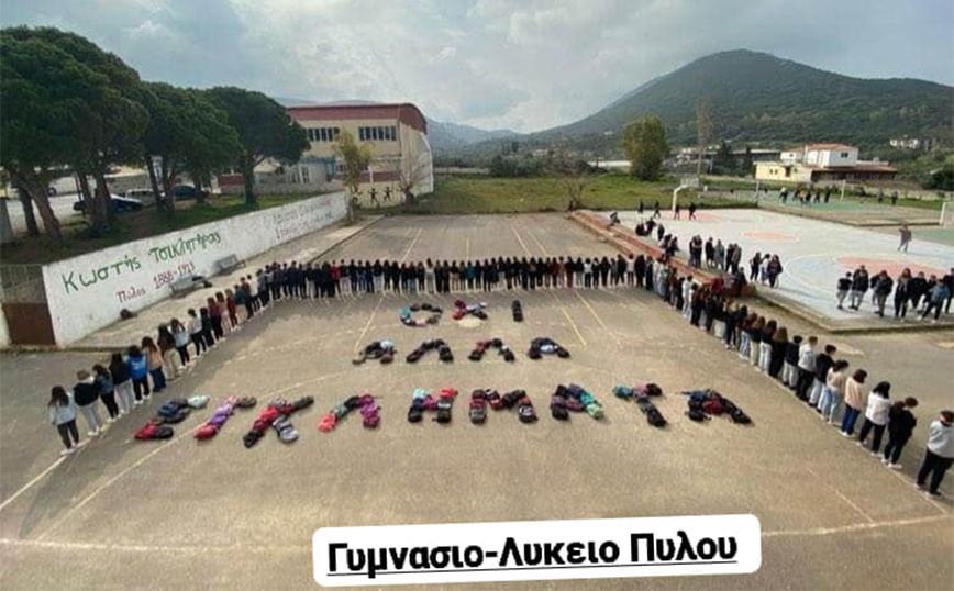 Οι μαθητές όπως μετέδωσε η ΕΡΤ συγκεντρώθηκαν στο προαύλιο του σχολείου και με τις σχολικές τους σάκες σχημάτισαν επίσης το μήνυμα: «Όχι άλλα εγκλήματα».
