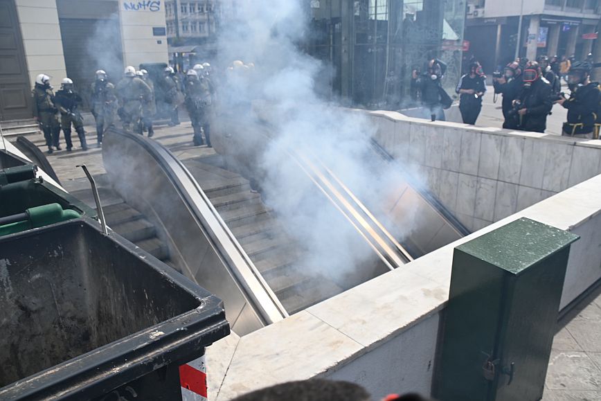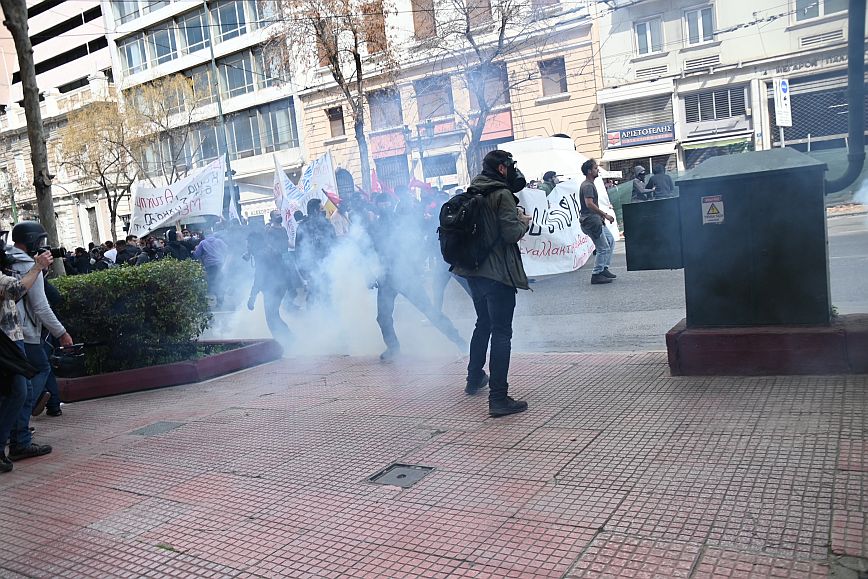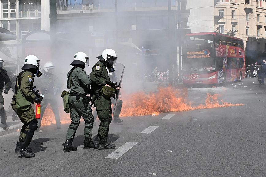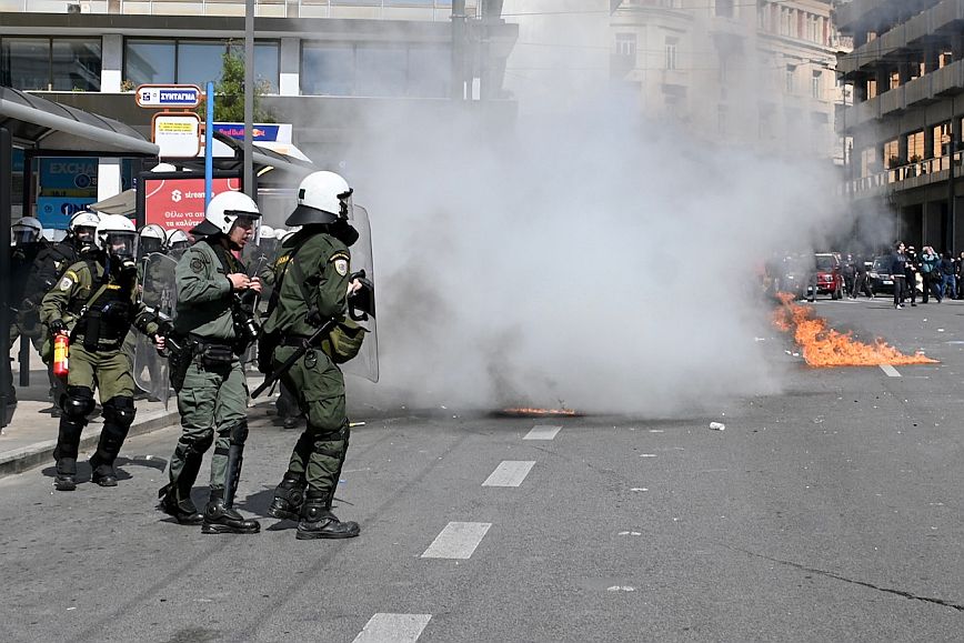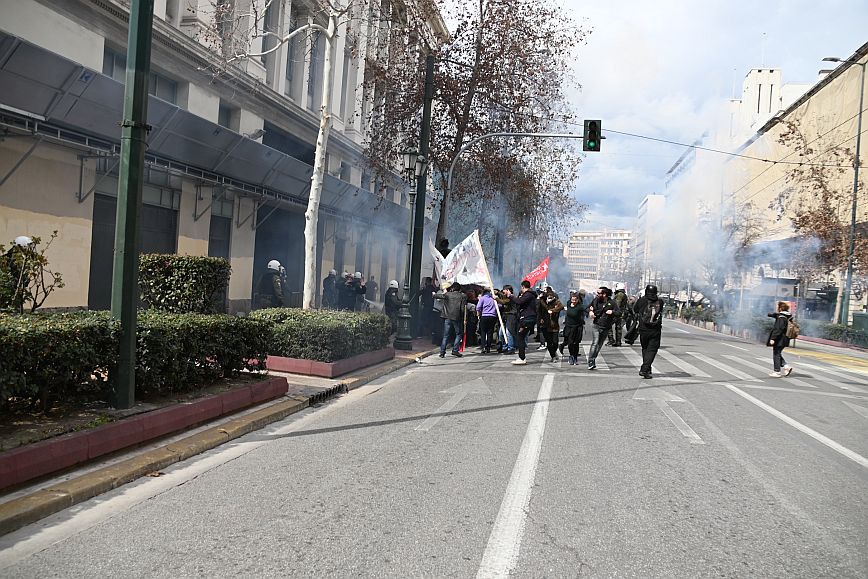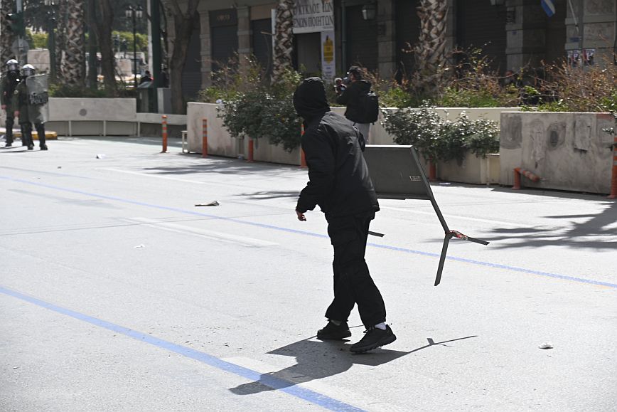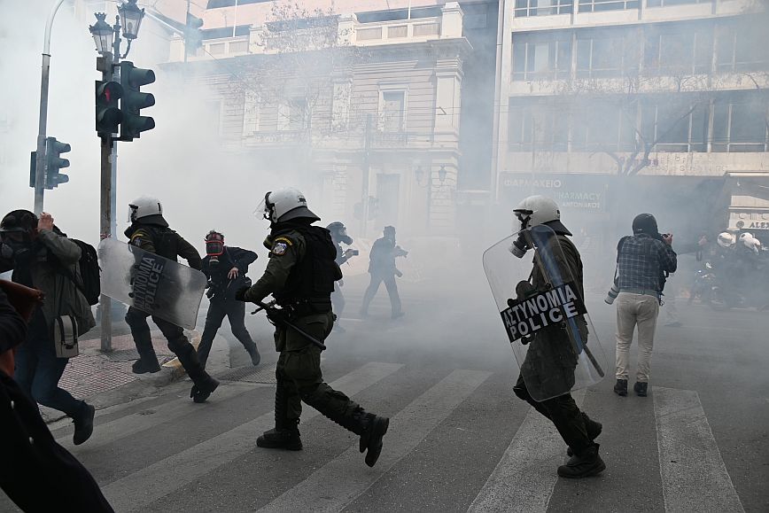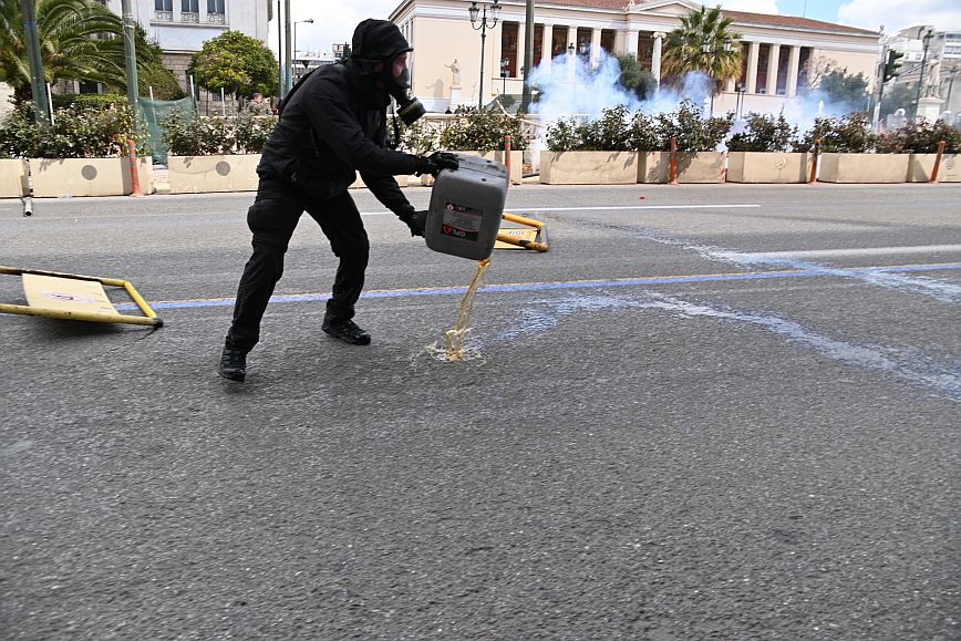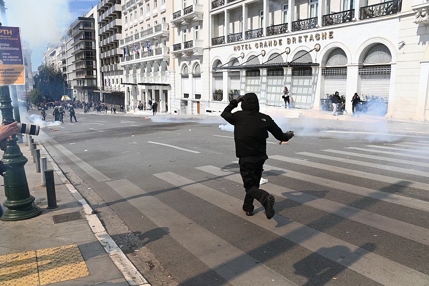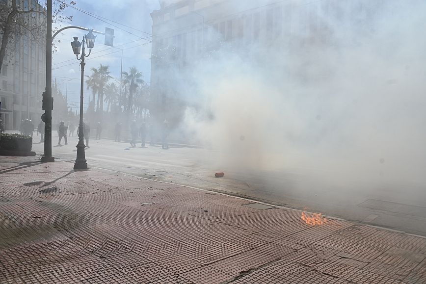 Σύμφωνα με πληροφορίες, ομάδα ατόμων, που είχαν καλυμμένα τα χαρακτηριστικά των προσώπων τους, επιτέθηκαν με φωτοβολίδες και πέτρες στην κάτω πλευρά της πλατείας Συντάγματος, και οι δυνάμεις των ΜΑΤ απάντησαν με ρίψη χημικών και βομβίδων κρότου λάμψης.
