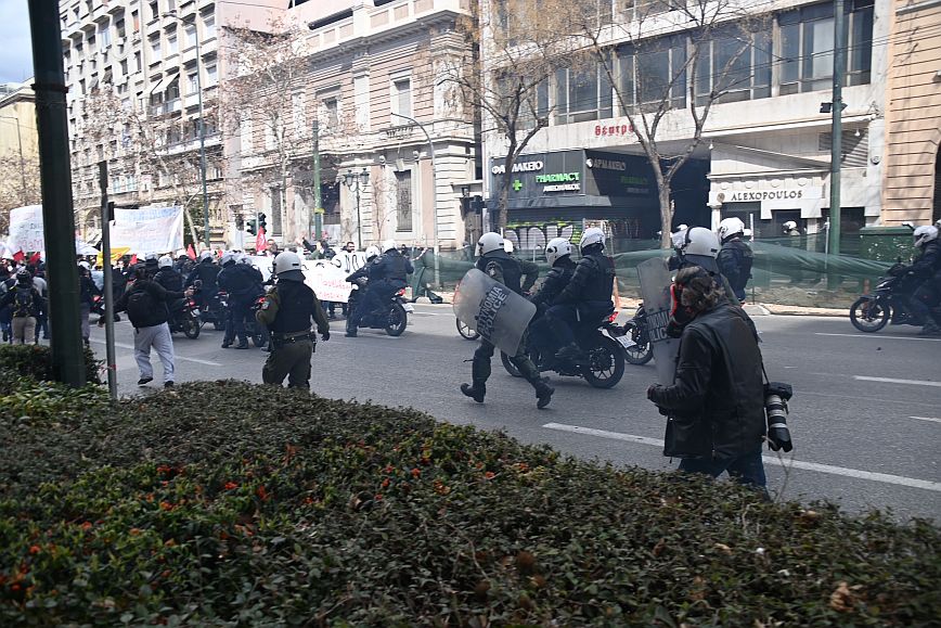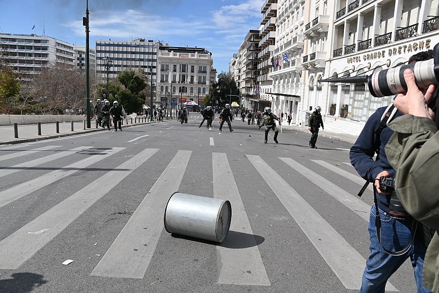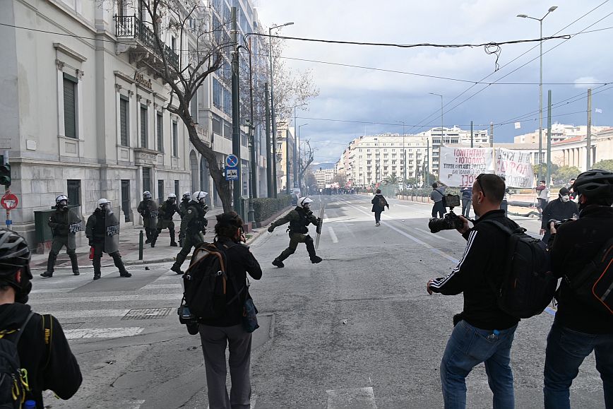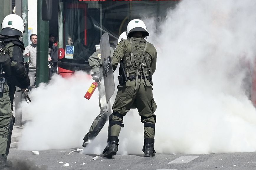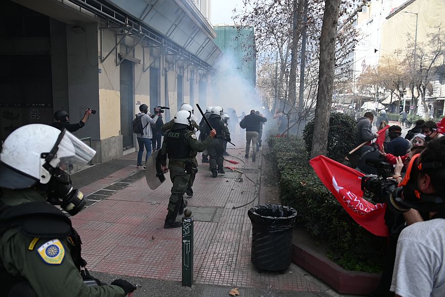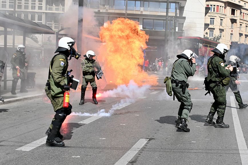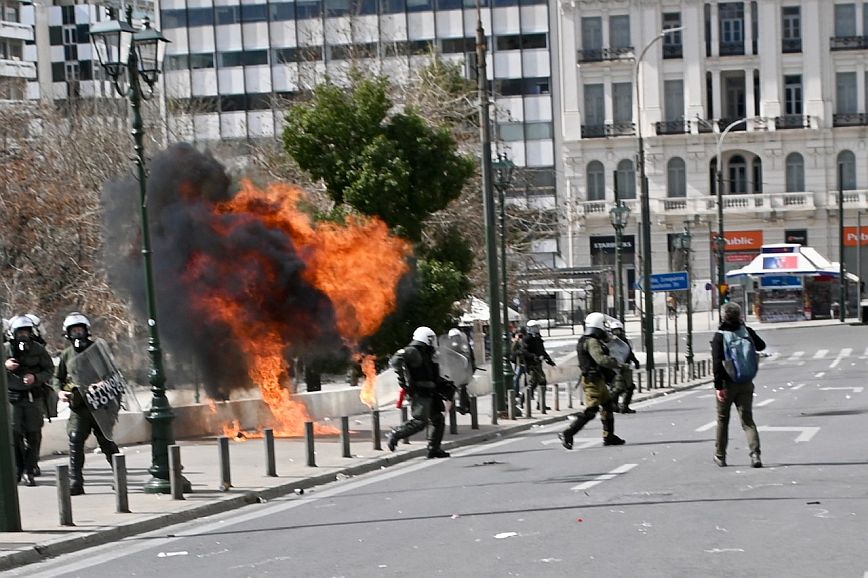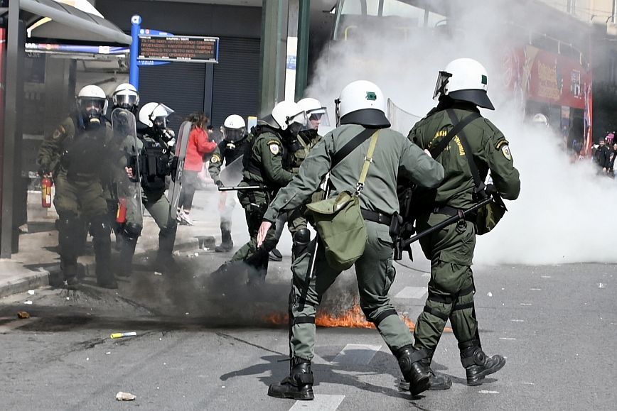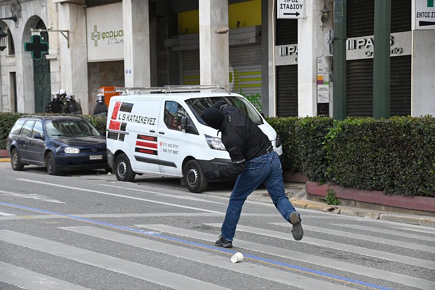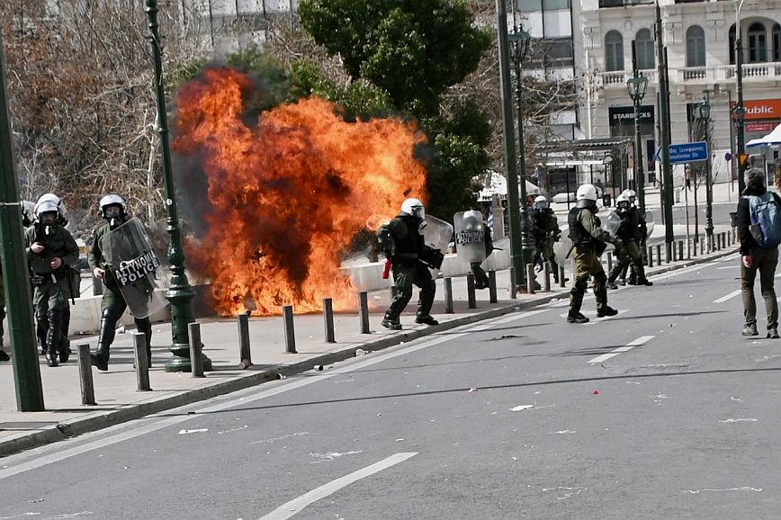 Σύμφωνα με πληροφορίες, ομάδα ατόμων, που είχαν καλυμμένα τα χαρακτηριστικά των προσώπων τους, επιτέθηκαν με φωτοβολίδες και πέτρες στην κάτω πλευρά της πλατείας Συντάγματος, και οι δυνάμεις των ΜΑΤ απάντησαν με ρίψη χημικών και βομβίδων κρότου λάμψης.
