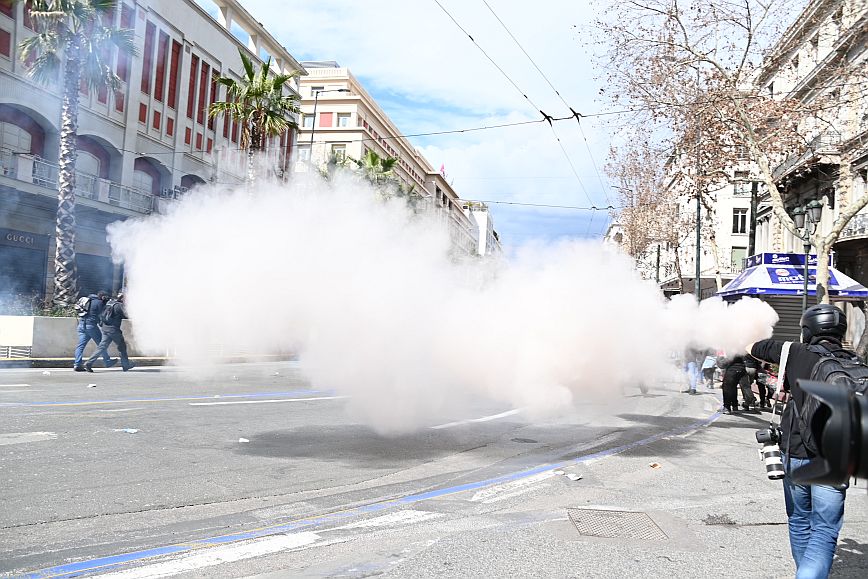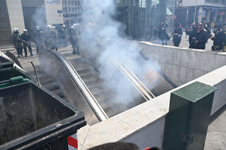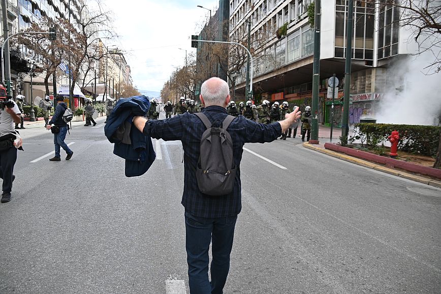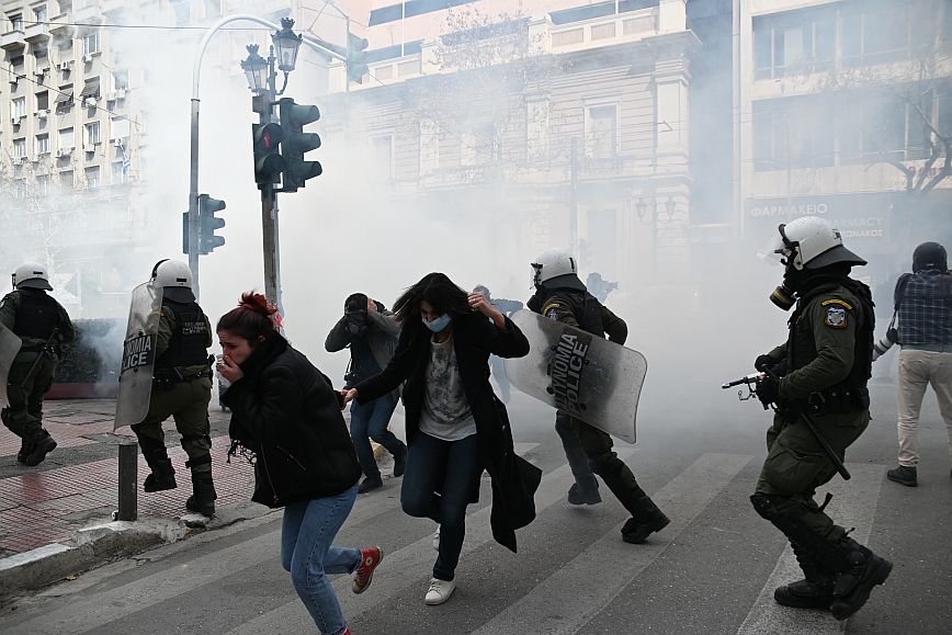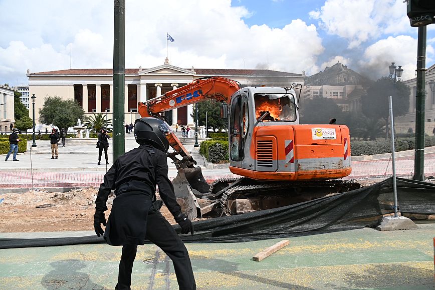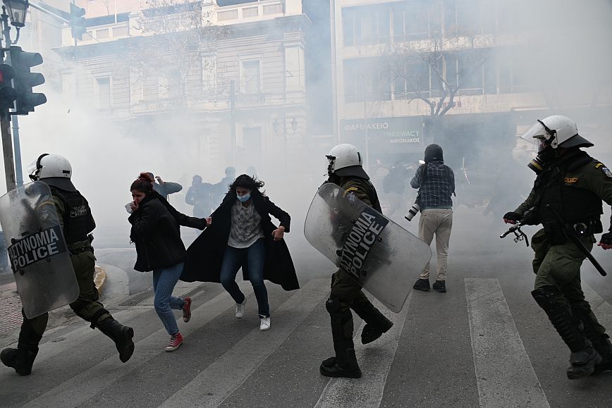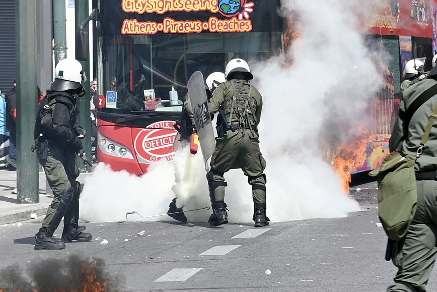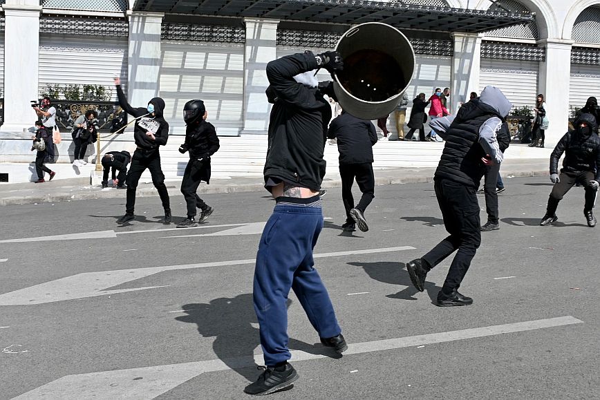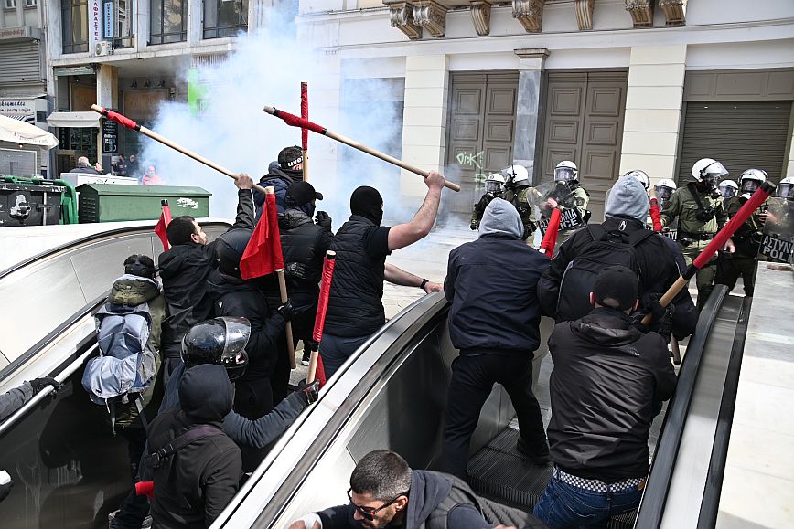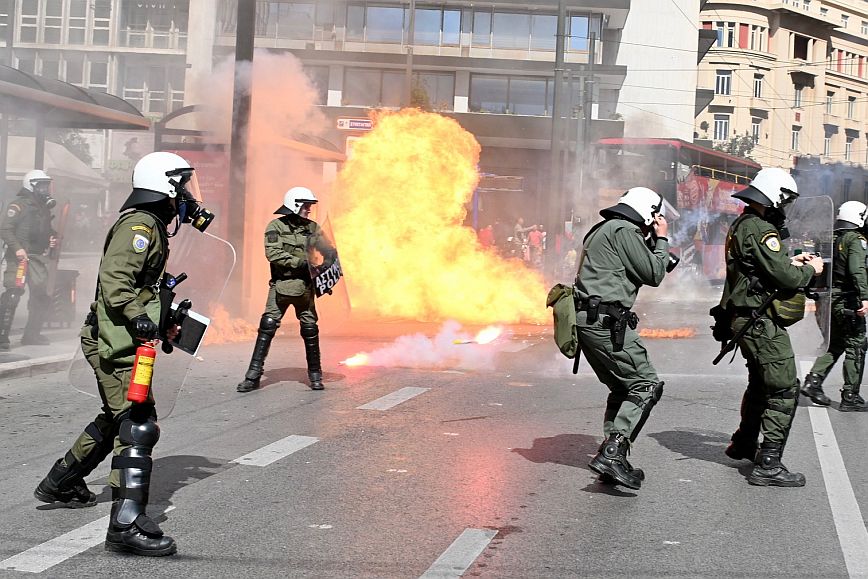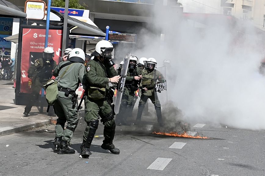 Σύμφωνα με πληροφορίες, ομάδα ατόμων, που είχαν καλυμμένα τα χαρακτηριστικά των προσώπων τους, επιτέθηκαν με φωτοβολίδες και πέτρες στην κάτω πλευρά της πλατείας Συντάγματος, και οι δυνάμεις των ΜΑΤ απάντησαν με ρίψη χημικών και βομβίδων κρότου λάμψης.