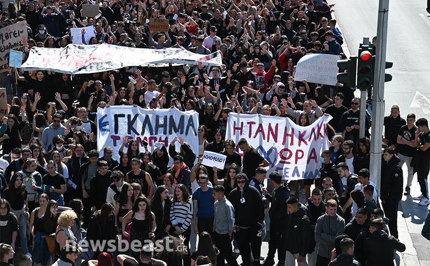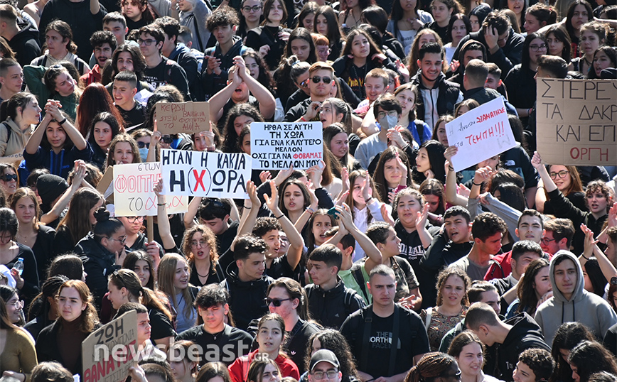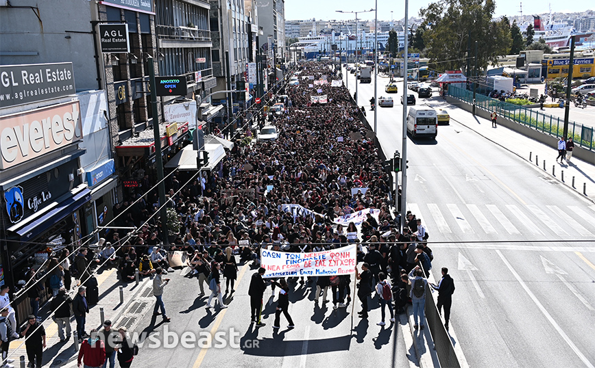 Μεγάλη η συμμετοχή των μαθητών στη διαμαρτυρία στον Πειραιά που τιμούν με τον δικό τους τρόπο τους 57 νεκρούς της σιδηροδρομικής τραγωδίας στα Τέμπη.