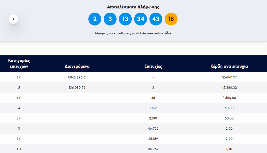 Οι τυχεροί αριθμοί λοιπόν, στη σημερινή κλήρωση Τζόκερ είναι οι εξής: 2, 3, 13, 34, 43 και Τζόκερ το 18.