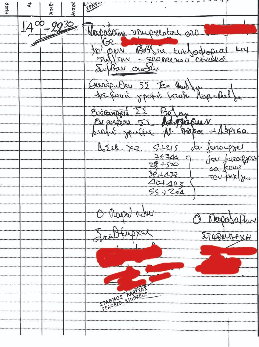 Πρόκειται, συγκεκριμένα, για το βιβλίο παράδοσης-παραλαβής που τηρείται στο σταθμαρχείο της Λάρισας, ώστε οι σταθμάρχες που αποχωρούν να γράφουν την ακριβή ώρα αποχώρησής τους και να αναφέρουν στο διάδοχο ή στους διαδόχους τους μπροστά στον πίνακα σιδηροδρομικής κυκλοφορίας τι ακριβώς παραλαμβάνουν.