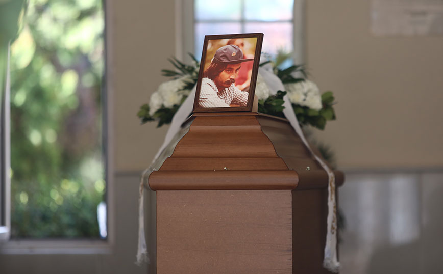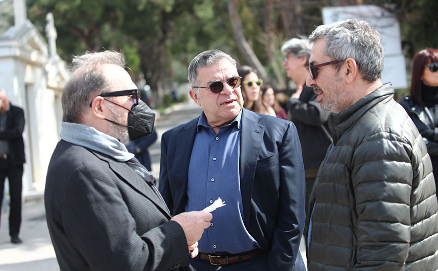 Τον Λάκη Παπαστάθη αποχαιρετούν στο νεκροταφείο του Βύρωνα ο φίλος του Διονύσης Σαββόπουλος και μεταξύ άλλων ο Σταμάτης Φασουλής, ο Κώστας Αρζόγλου και ο Χρήστος Χατζηπαναγιώτης, ο Δημήτρης Καταλειφός, ο Παντελής Βούλγαρης, η Σία Αναγνωστοπούλου, η Ελένη Ζιώγα, ο Αίας Μανθόπουλος, η Σοφία Ζαχαράκη κ.ά. Όλοι βρίσκονται δίπλα στη σύζυγο του Λάκη Παπαστάθη, την ηθοποιό Υβόννη Μαλτέζου και τον γιο τους, Αργύρη.