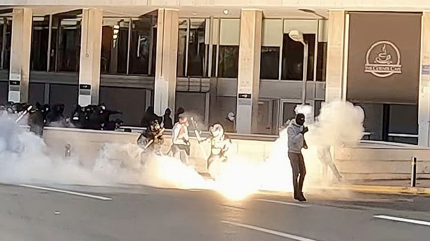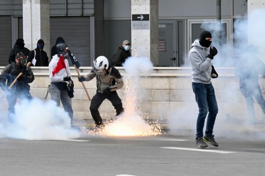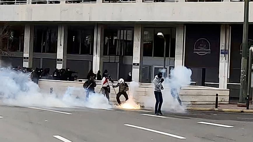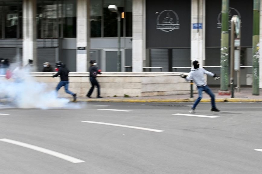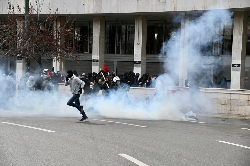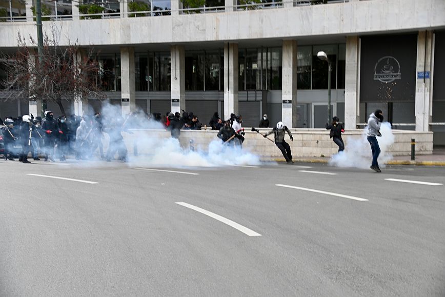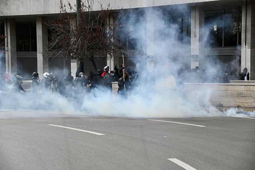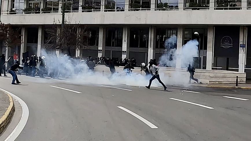 Συγκεκριμένα, άγνωστοι με καλυμμένα τα πρόσωπά τους προχώρησαν σε ρίψη αντικειμένων προς τις δυνάμεις των ΜΑΤ, οι οποίες απάντησαν με χημικά και κροτίδες κρότου-λάμψης.