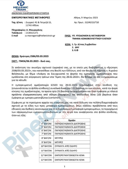 Αναλυτικά το έγγραφο αναφέρει: «Σε απάντηση του ανωτέρω σχετικού έγγραφού σας, με το οποίο μας διαβιβάστηκε η ‘Ερώτηση 2506/03.03.2023′, που κατατέθηκε στη Βουλή των Ελλήνων, από τον Βουλευτή Λάρισας κ. Κυριάκο Βελόπουλο, με θέμα Ανάγκη να διευκρινιστεί το φορτίο της εμπορικής αμαξοστοιχίας που εμπλέκεται στη σύγκρουση τρένων στα Τέμπη της 28.02.2023’, θα θέλαμε να σας ενημερώσουμε για τα κάτωθι: