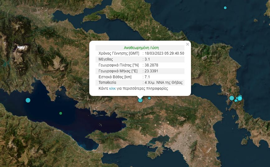 Σεισμική δόνηση μεγέθους 3,1 βαθμών της κλίμακας Ρίχτερ σημειώθηκε το πρωί του Σαββάτου στη Θήβα, σύμφωνα με το Γεωδυναμικό Ινστιτούτο του Εθνικού Αστεροσκοπείου Αθηνών.