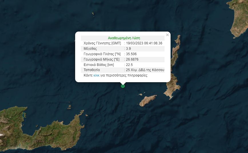 Το επίκεντρο του σεισμού εντοπίζεται στη θαλάσσια περιοχή 25 χιλιόμετρα δυτικά βορειοδυτικά της Κάσου και είχε εστιακό βάθος στα 22,5 χιλιόμετρα.