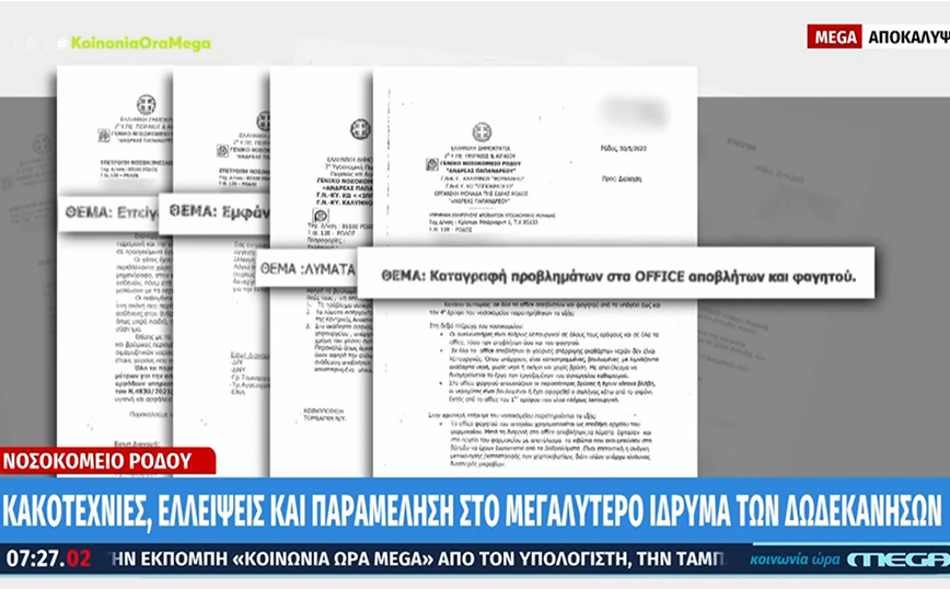 Τραγική είναι η κατάσταση στο νοσοκομείο Ρόδου, όπου κυκλοφορούν γάτες, περιστέρια ακόμα και ποντίκια σε αγγειογράφο. Το Mega αποκαλύπτει έγγραφα που έχουν φτάσει στο εσωτερικό του νοσοκομείου της Ρόδου από διάφορους τομεάρχες και επικεφαλής των εκάστοτε τμημάτων. Είναι αναφορές προς τη διοίκηση του νοσοκομείου, και οι ημερομηνίες αφορούν από πέρσι τον Μάρτιο μέχρι και σήμερα.