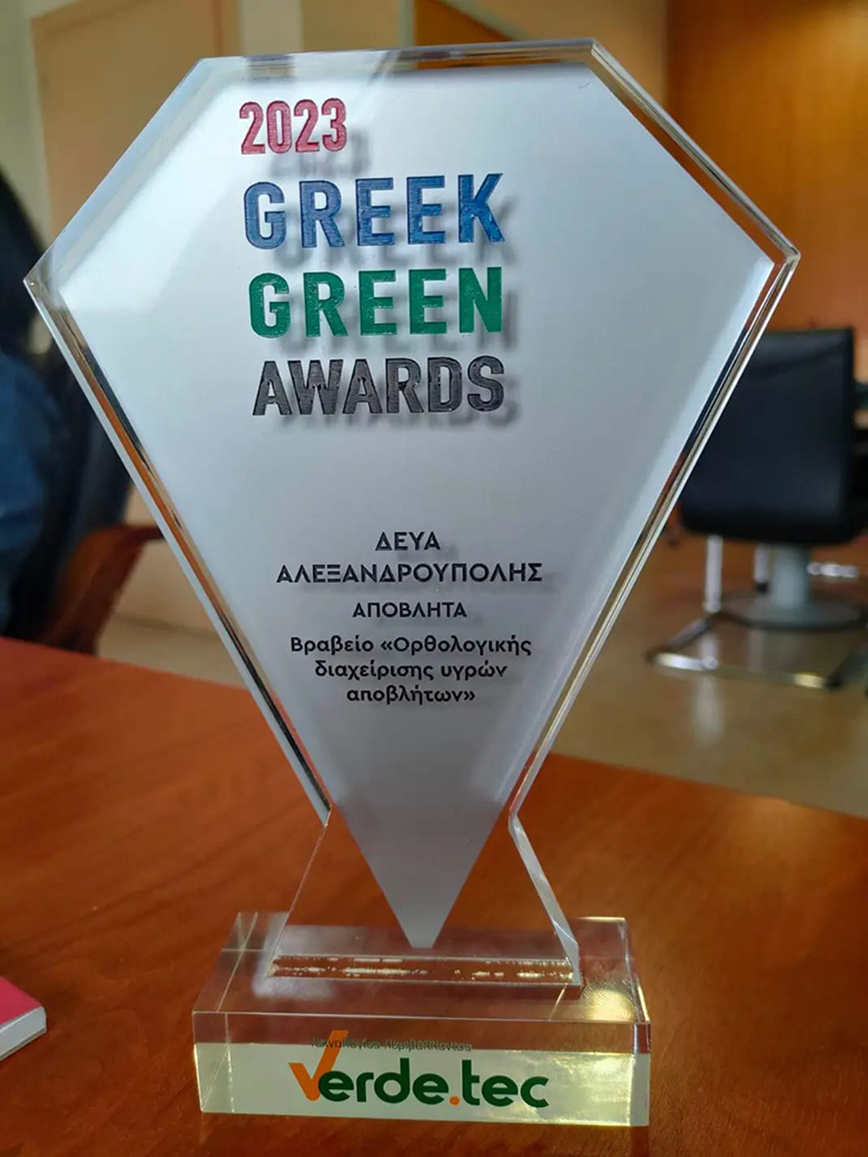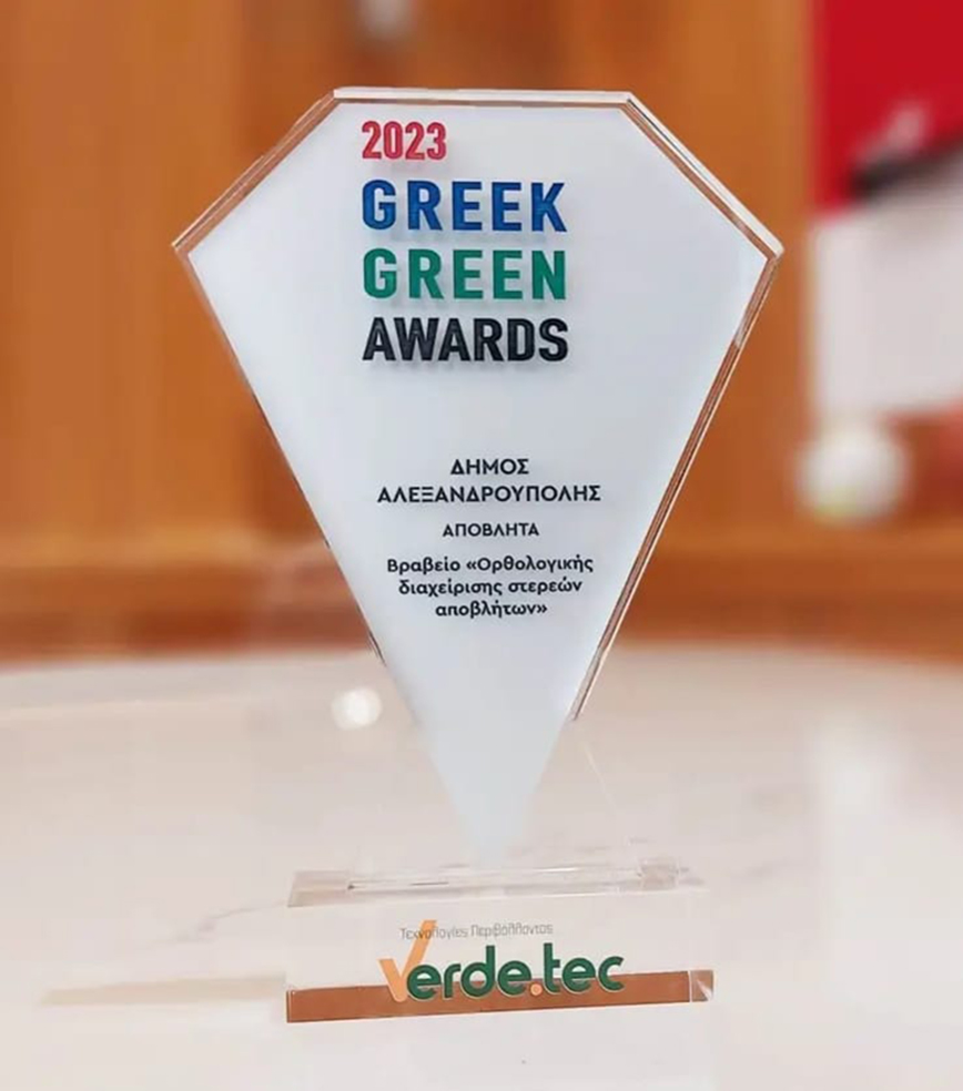 Στο πλαίσιο της έκθεσης, σε μία κατάμεστη αίθουσα, πραγματοποιήθηκε “η γιορτή του περιβάλλοντος”, τα Greek Green Awards, όπου ο δήμος Αλεξανδρούπολης βραβεύτηκε για την ΟΡΘΟΛΟΓΙΚΗ ΔΙΑΧΕΙΡΙΣΗ ΤΩΝ ΣΤΕΡΕΩΝ ΑΠΟΒΛΗΤΩΝ, ενώ βραβείο απέσπασε και η Δημοτική Επιχείρηση Ύδρευσης – Αποχέτευσης Δήμου Αλεξανδρούπολης (ΔΕΥΑΑ) για την ΟΡΘΟΛΟΓΙΚΗ ΔΙΑΧΕΙΡΙΣΗ ΥΓΡΩΝ ΑΠΟΒΛΗΤΩΝ με τη μέθοδο της βιοενίσχυσης, που εφαρμόζεται στις αναβαθμισμένες εγκαταστάσεις επεξεργασίας λυμάτων της ΔΕΥΑΑ του Δήμου Αλεξανδρούπολης. Εκ μέρους του Δήμου Αλεξανδρούπολης το βραβείο παρέλαβε ο Γενικός Γραμματέας Ιωάννης Μπόγδης, ενώ το βραβείο της ΔΕΥΑΑ παρέλαβε η γενική διευθύντρια Κυριακή Χαμουρατίδου.