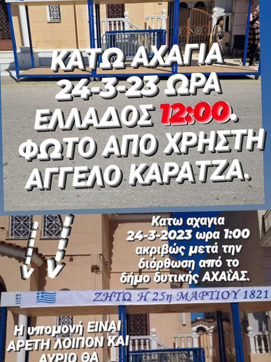 «Επειδή μάλλον είναι δύσκολο να ξεχωρίσουν κάποιοι τι μήνα έχουμε και τι γιορτάζουμε αύριο ας το διορθώσουν άμεσα γιατί ……. Κάτω Αχαΐα 24-3-2023. Ζήτω η 25 Μαρτίου!».