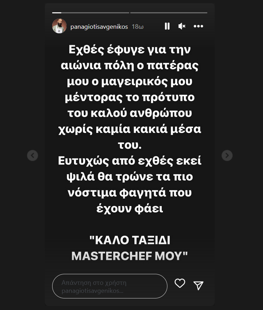 «Χθες έφυγε για την αιώνια πόλη ο πατέρας μου, ο μαγειρικός μου μέντορας, το πρότυπο του καλού ανθρώπου χωρίς καμία κακία μέσα του. Ευτυχώς από χθες εκεί ψηλά θα τρώνε τα πιο νόστιμα φαγητά που έχουν φάει. Καλό ταξίδι MasterChef μου».