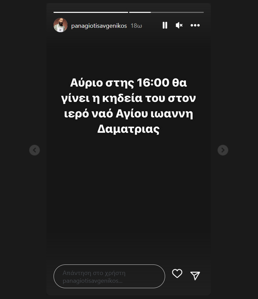 Η κηδεία του θα γίνει σήμερα στις 16:00 στον ιερό ναό Αγίου Ιωάννη Δαματριάς.