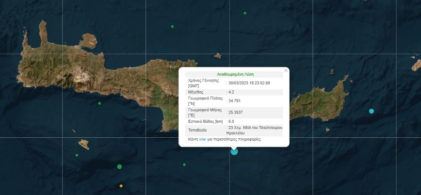 Σύμφωνα με το Γεωδυναμικό Ινστιτούτο, ο σεισμός είχε μέγεθος 4,2 Ρίχτερ, το εστιακό βάθος εντοπίζεται στα 6 χιλιόμετρα και το επίκεντρο εντοπίζεται στα 23 χιλιόμετρα νότια νοτιοανατολικά του Ηρακλείου.