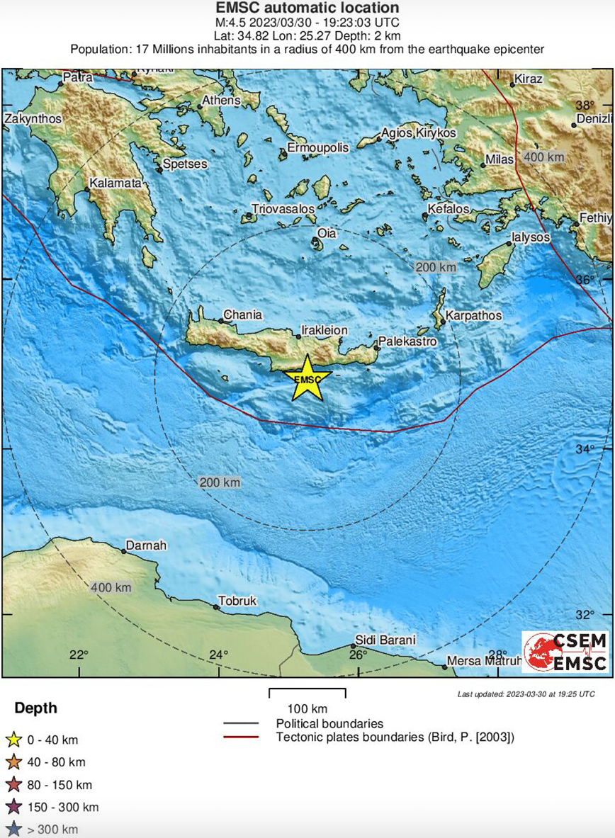 Σεισμός σημειώθηκε αργά το βράδυ της Πέμπτης στην Κρήτη. Η σεισμική δόνηση είχε μέγεθος 4,6 Ρίχτερ ενώ το εστιακό του βάθος εντοπίζεται στα 2 χιλιόμετρα σύμφωνα με το Ευρωμεσογειακό Ινστιτούτο. Το επίκεντρο σεισμού εντοπίζεται 69 χιλιόμετρα νότια νοτιοανατολικά του Ηρακλείου.