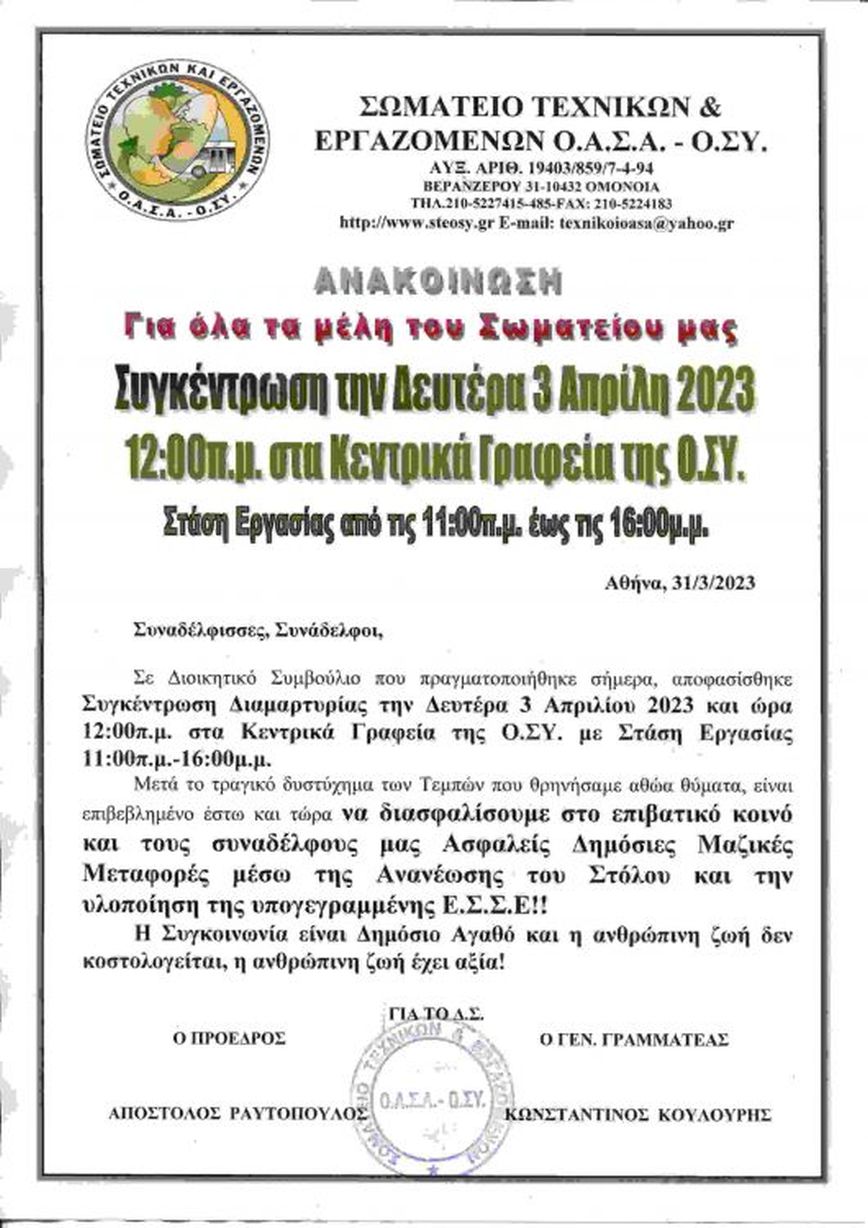 Η στάση εργασίας στα λεωφορεία τη Δευτέρα 3 Απριλίου γίνεται προκειμένου να πραγματοποιηθεί και συγκέντρωση διαμαρτυρίας στις 12: 00 στα κεντρικά γραφεία της ΟΣΥ προκύρηξε το Σωματείο Τεχνικών και Εργαζόμενων ΟΑΣΑ-ΟΣΥ.