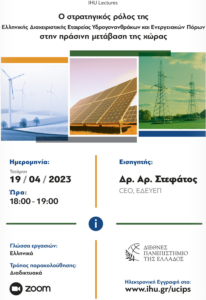 Στη σειρά των μηνιαίων διαλέξεων στο Διεθνές Πανεπιστήμιο Ελλάδος, θα συζητηθεί «ο στρατηγικός ρόλος της Ελληνικής Διαχειριστικής Εταιρείας Υδρογονανθράκων και Ενεργειακών Πόρων στην πράσινη μετάβαση της χώρας» με επίσημο προσκεκλημένο και εισηγητή τον Δρα. Αριστοφάνη Στεφάτο.
