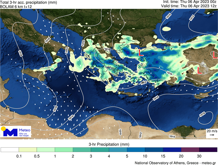 Στους προγνωστικούς χάρτες που ακολουθούν, αποτυπώνεται η γεωγραφική κατανομή των φαινομένων κατά τα διαστήματα 12:00 – 15:00 και 18:00 – 21:00 (ώρα Ελλάδας) της Πέμπτης 06/04.