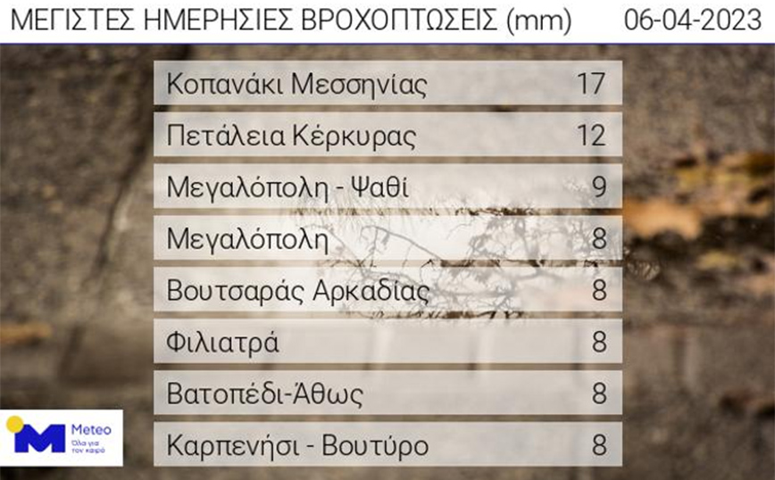 Στον πίνακα που ακολουθεί παρουσιάζονται οι 8 σταθμοί του που κατέγραψαν τα μεγαλύτερα ύψη βροχόπτωσης έως τις 08:00. Το μεγαλύτερο ύψος βροχόπτωσης έχει καταγραφεί στο μετεωρολογικό σταθμό που βρίσκεται στο Κοπανάκι Μεσσηνίας και είναι ίσο με 17 χιλιοστά.