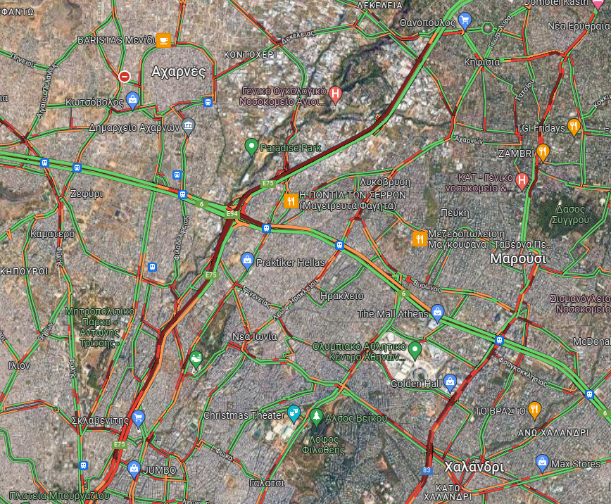 Την ίδια ώρα στην άνοδο του Κηφισού η κίνηση ξεκινά από το ύψος της Λαχαναγοράς του Ρέντη και φτάνει μέχρι τη Νέα Φιλαδέλφεια.