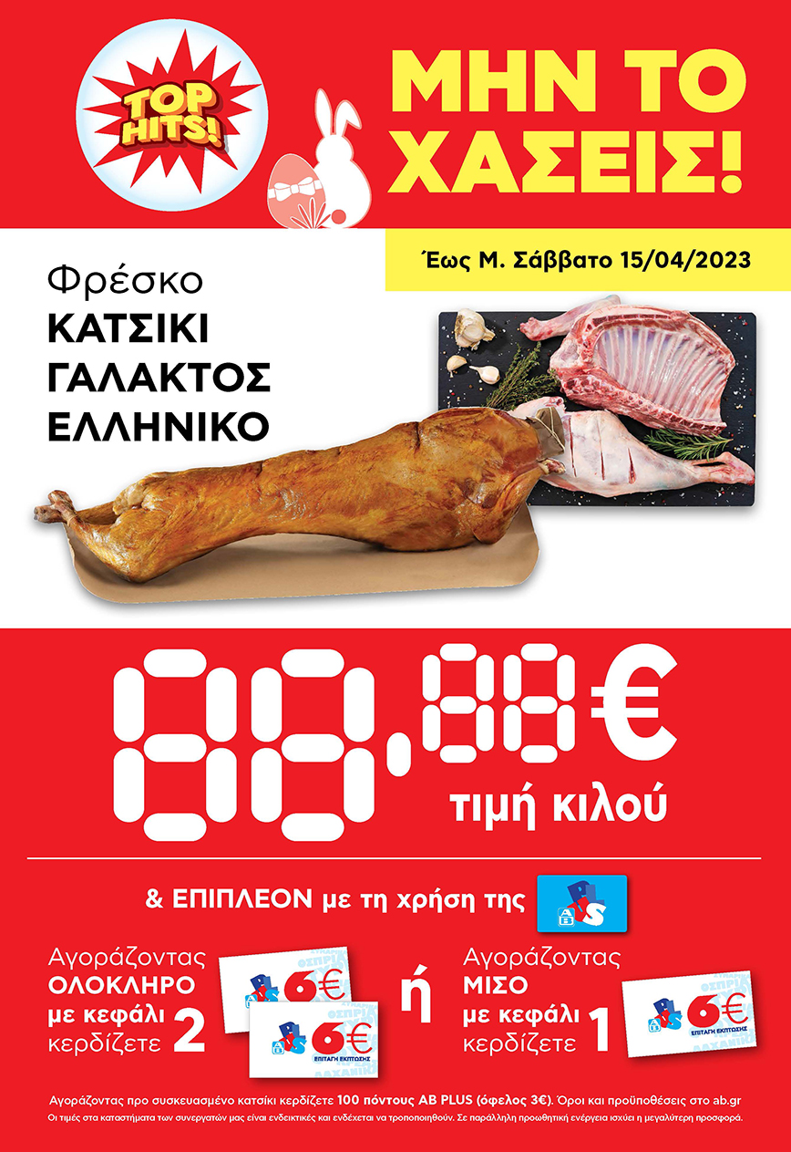 Επιπλέον, φέτος, αγοράζοντας στα ΑΒ Ελληνικά αρνιά και κατσίκια, εκτός από την καλύτερη τιμή της αγοράς, έχουμε και έξτρα όφελος με την κάρτα AB Plus. Αγοράζοντας 1 ολόκληρο αρνί ή κατσίκι θα έχουμε επιπλέον όφελος 12 ευρώ, μισό αρνί ή κατσίκι προσφέρει όφελος 6 ευρώ, ενώ μέσω AB E-shop κερδίζουμε επιπλέον όφελος 3 ευρώ αγοράζοντας συσκευασμένο αρνί ή κατσίκι.