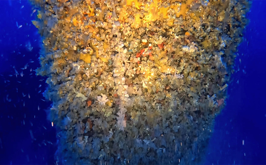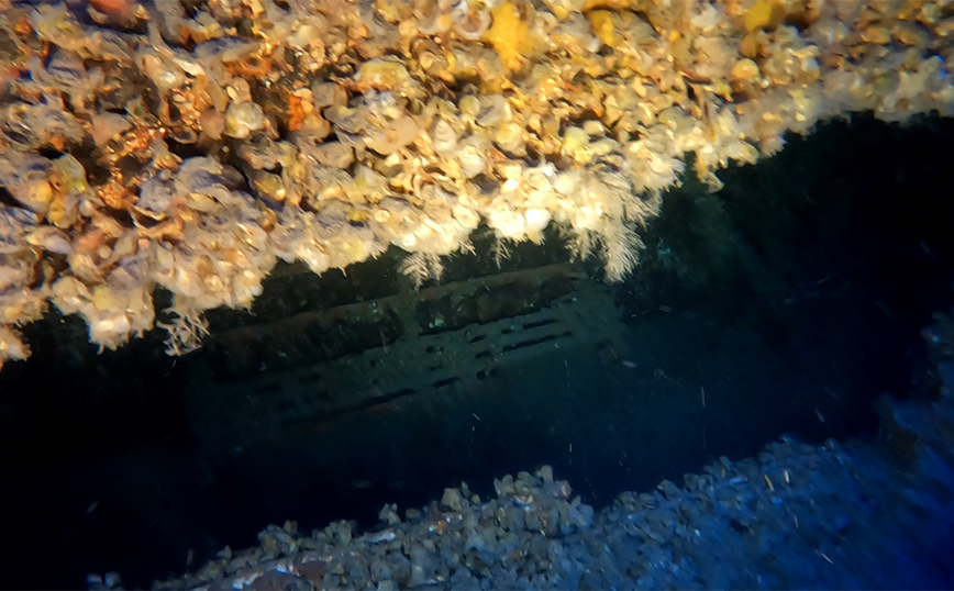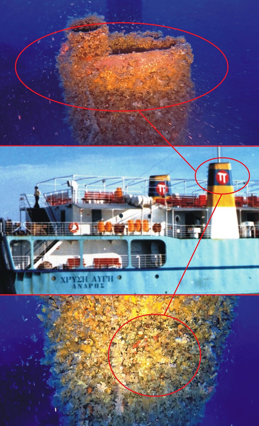 Ξεχωρίζουν τα χαρακτηριστικά φουγάρα κίτρινου χρώματος με το ασπροκόκκινο λογότυπο της πλοιοκτήτριας εταιρείας, το γράμμα Π . Για την επιχείρηση εντοπισμού και ταυτοποίησης χρησιμοποιήθηκε ειδικό υποβρύχιο τηλεκατευθυνόμενο όχημα ROV (Remote Operated Vehicle). Ο καταπέλτης της πρύμνης είναι κλειστός και ασφαλισμένος, οι άγκυρες είναι στη θέση τους στα όκια του πλοίου, ενώ παρατηρείται μετατόπιση ελασμάτων προς τα δεξιά. Πάνω στο ναυάγιο υπάρχουν αλιευτικά εργαλεία, όπως το δίχτυ δίπλα στη σκάλα που οδηγούσε στο ανώτερο κατάστρωμα της πρύμνης.