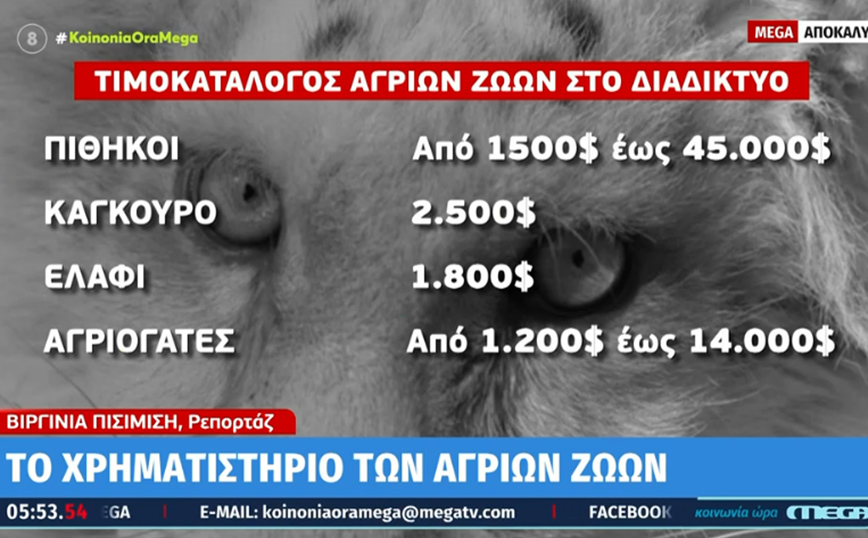 Το ρεπορτάζ που παρουσιάστηκε στην εκπομπή «Κοινωνία Ώρα Mega» με τους Ιορδάνη Χασαπόπουλο και Ανθή Βούλγαρη, η ρεπόρτερ Βιργινία Πισιμίση ανέφερε πως μέσω ιστοσελίδων του εξωτερικού για λαθρεμπόριο ζώων, κυρίως αμερικάνικων, μπορεί κανείς να «παραγγείλει» από λευκή τίγρη, μέχρι και αλεπού. Οι τιμές κυμαίνονται από 400 δολάρια και φτάνουν μέχρι την εξωφρενική τιμή των 100.000 δολαρίων.