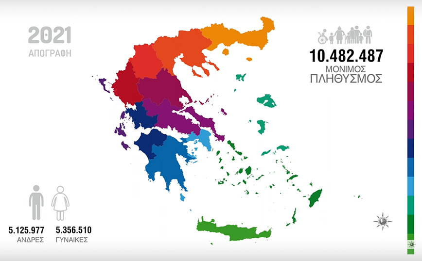 Τα επίσημα στοιχεία της απογραφής του πληθυσμού της χώρας για το 2021, δημοσίευσε η Ελληνική Στατιστική Αρχή. Οι ολοκληρωμένες μετρήσεις των αποτελεσμάτων των στοιχείων αναφέρουν πως ο συνολικός μόνιμος πληθυσμός της Ελλάδας ανέρχεται σε 10.482.487 άτομα, εκ των οποίων το 51,1% είναι γυναίκες (5.356.510) και το 48,9% άντρες (5.125.977). Σύμφωνα με αυτά τα στοιχεία, ο συνολικός αριθμός των πολιτών της Ελλάδας έχει μειωθεί κατά 3,1%, συγκριτικά με την απογραφή του 2011.